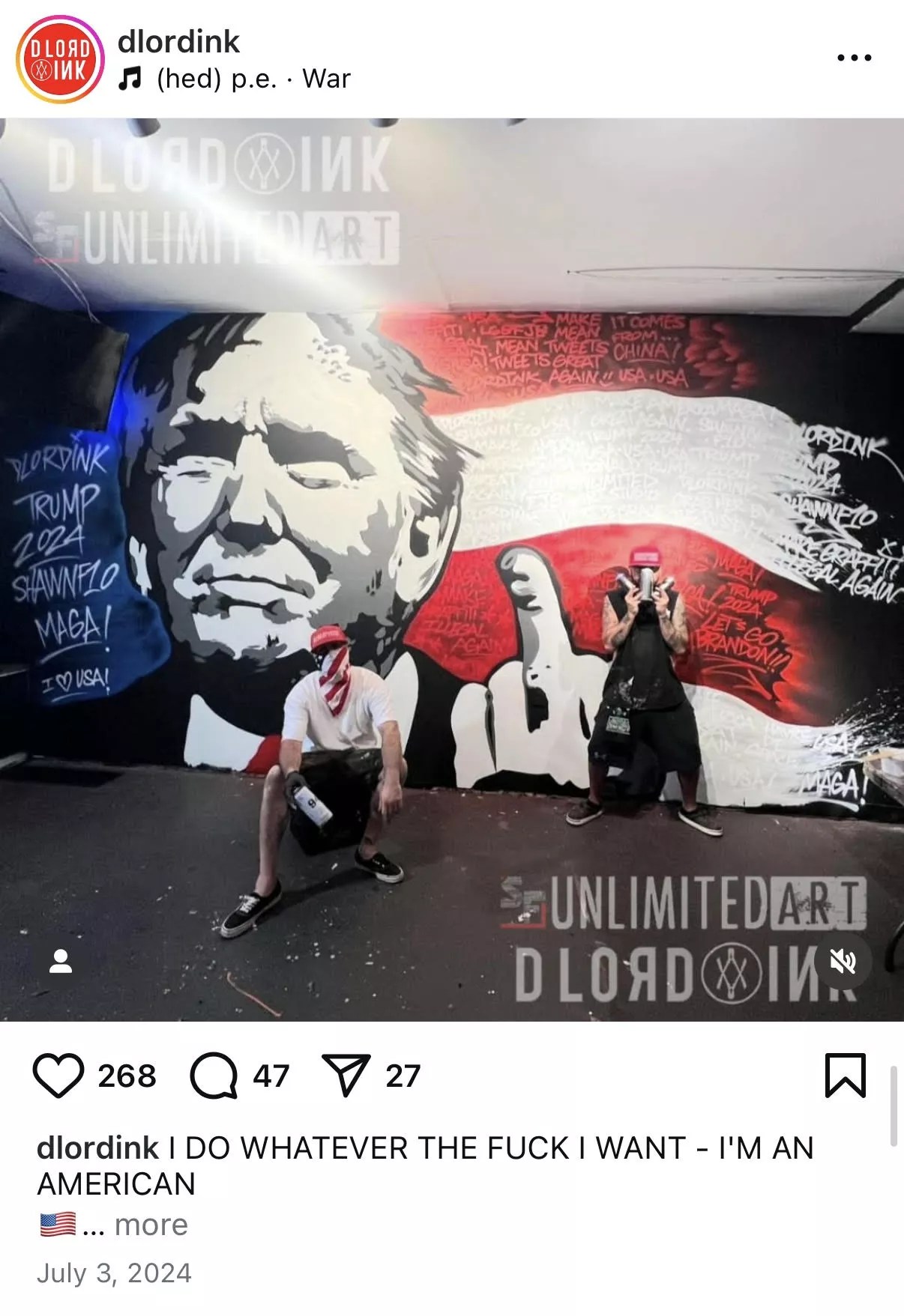 His comments accompanying the photos and videos can be just as caustic. In a 2024 Instagram post featuring a Trump mural he painted with Forton, he wrote: “I DO WHATEVER THE FUCK I WANT – I’M AN AMERICAN.”