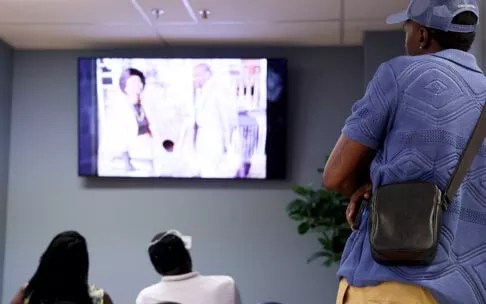 A documentary titled “Through a Lens Darkly: Black Photographers and the Emergence of a People” plays in the exhibit while visitors look on.