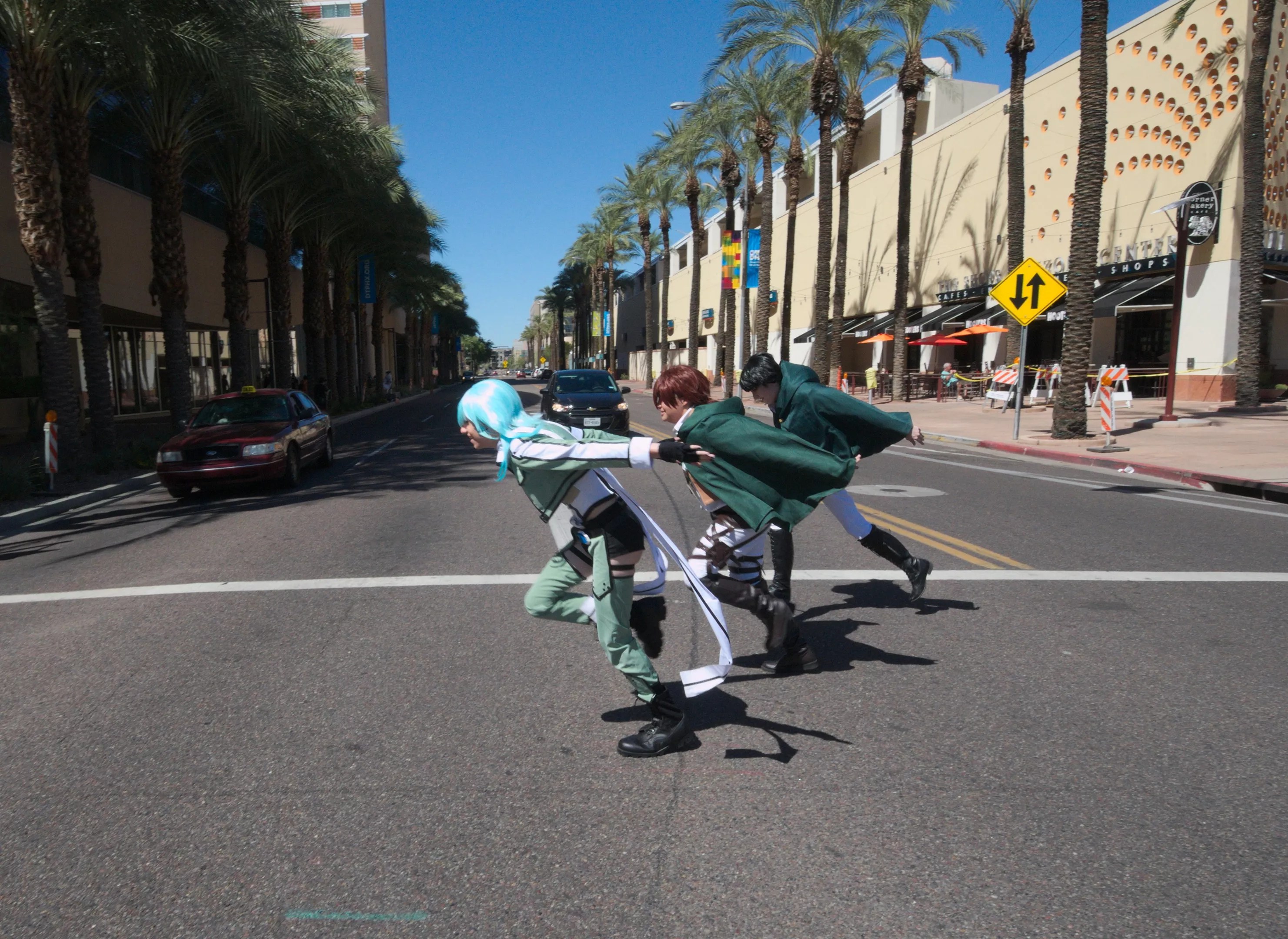 A trio of Attack on Titan cosplayers zoom through the crosswalk at Third and Van Buren streets outside of the Sheraton Grand Phoenix Hotel.