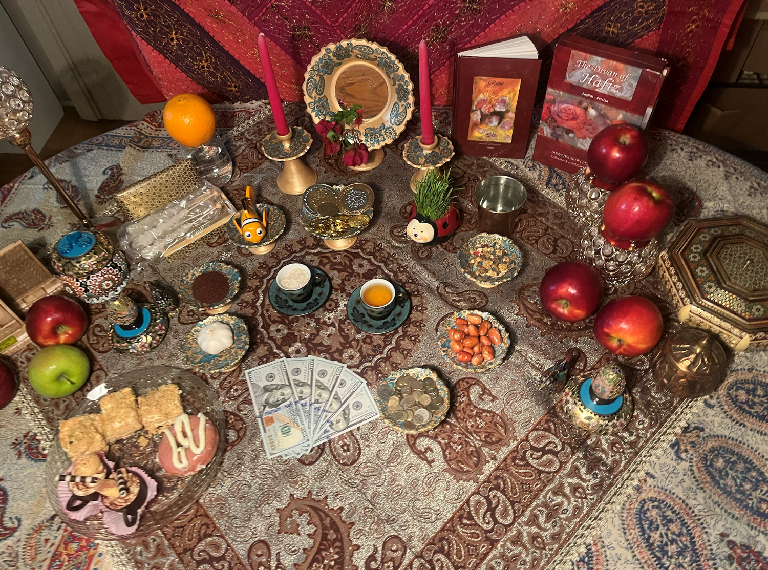 The Haft-Sin table (haft meaning seven and sin representing the letter “s”) is composed of sabzeh, samanu, senjed, serkeh, seeb, seer and somaq – sprouts, sweets, fruit, vinegar, apple, garlic and sumac.