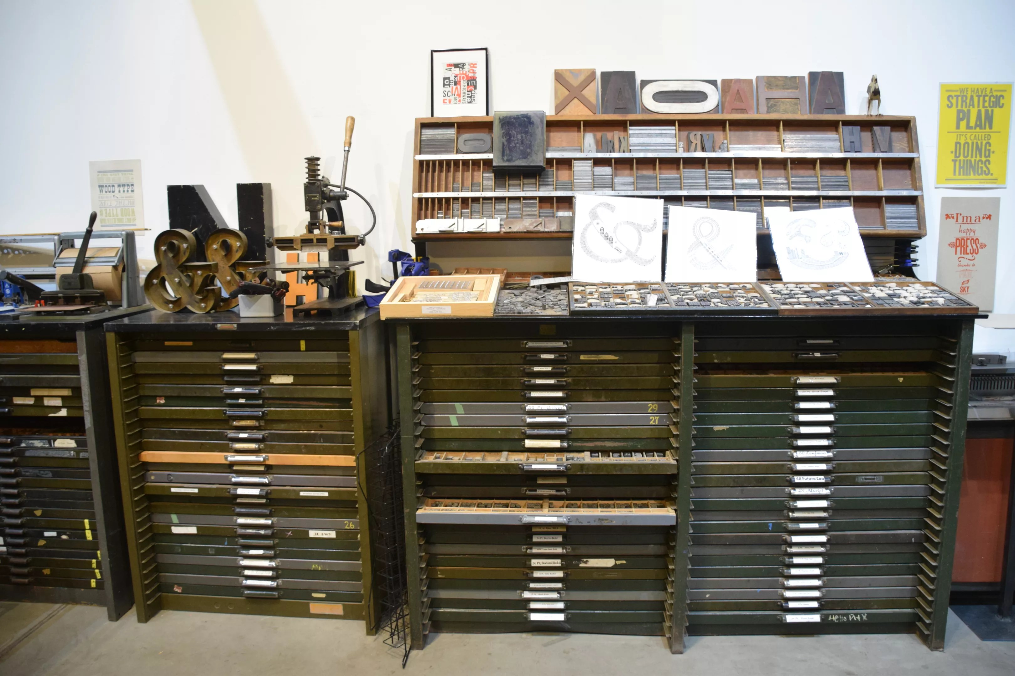 Established in 2008, Hazel & Violet Letterpress is a custom and public letterpress printing shop known for wedding invitations and announcements, stationery, greeting cards, business cards, and broadsides. They also print the work of local designers and artists, and offer little shop items like posters, tags, and coasters. Proprietors and printers Nancy Hill and Beverly Wolfe also offer letterpress workshops and tours of the studio. They print on a 1922 Chandler & Price, a 1935 Vandercook #01, and a 1969 Vandercook HS27, among others.