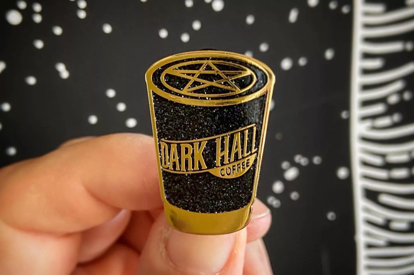 The pentagram latte art enamel pin from Dark Hall Coffee.