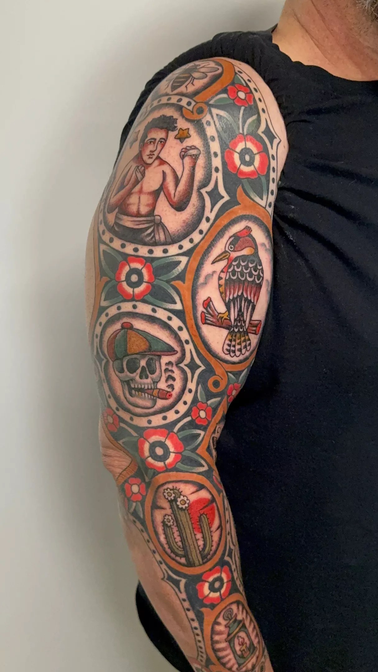 The veteran artist throws unexpected subject matter into a time machine to create custom American Traditional-style tattoos. His bold, hard-lined designs pay homage to artists of the past as he finds a balance between retro and modern-day perspectives.