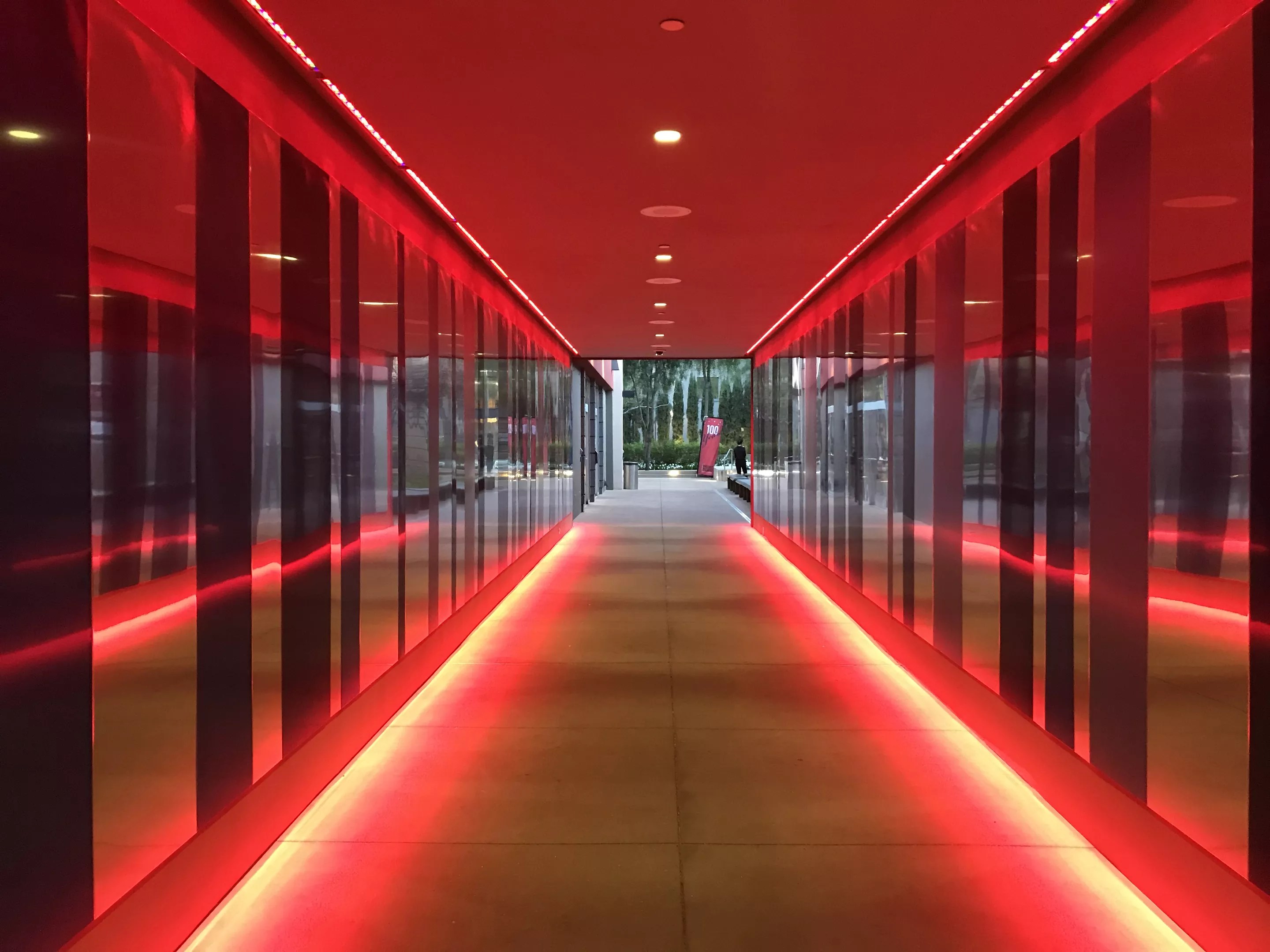 For years, it’s kept a small framed, autographed photograph of Spielberg in its lobby. But now it’s going for a much splashier look, and asking the city to give the thumbs-up. The entryway is currently home to a public art installation comprising a hallway of vertical mirrors, accentuated at night with red and blue lighting.