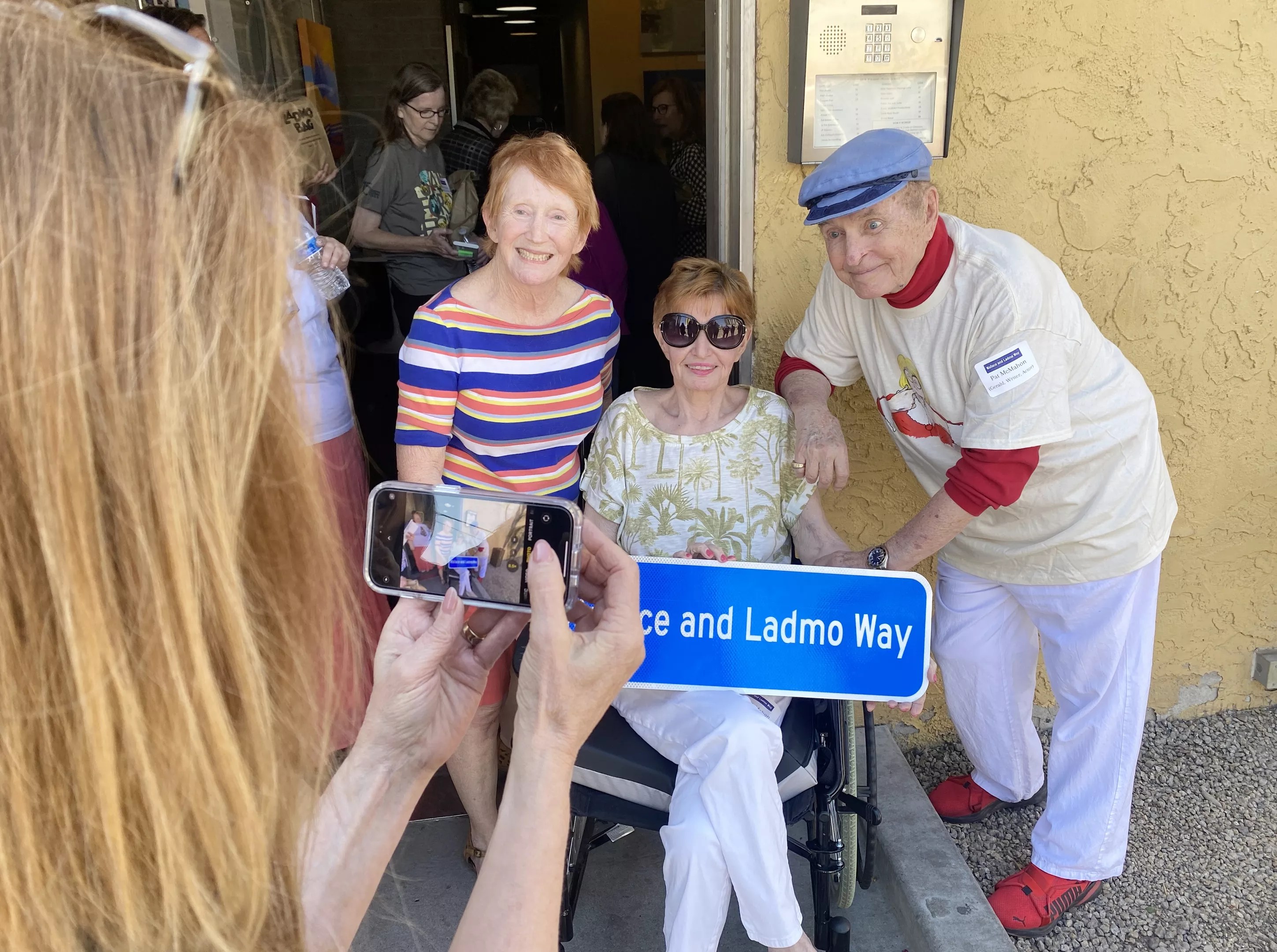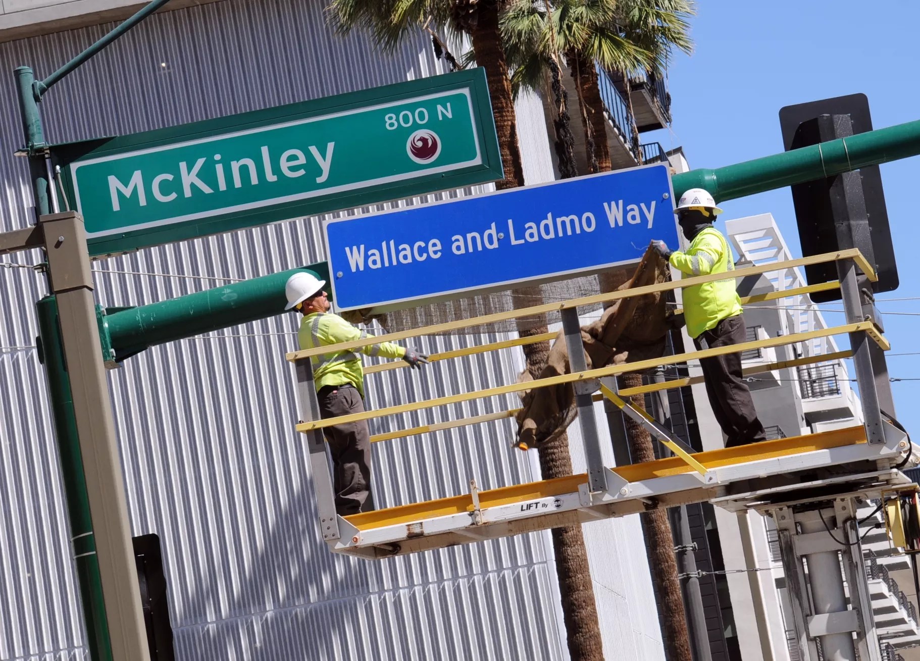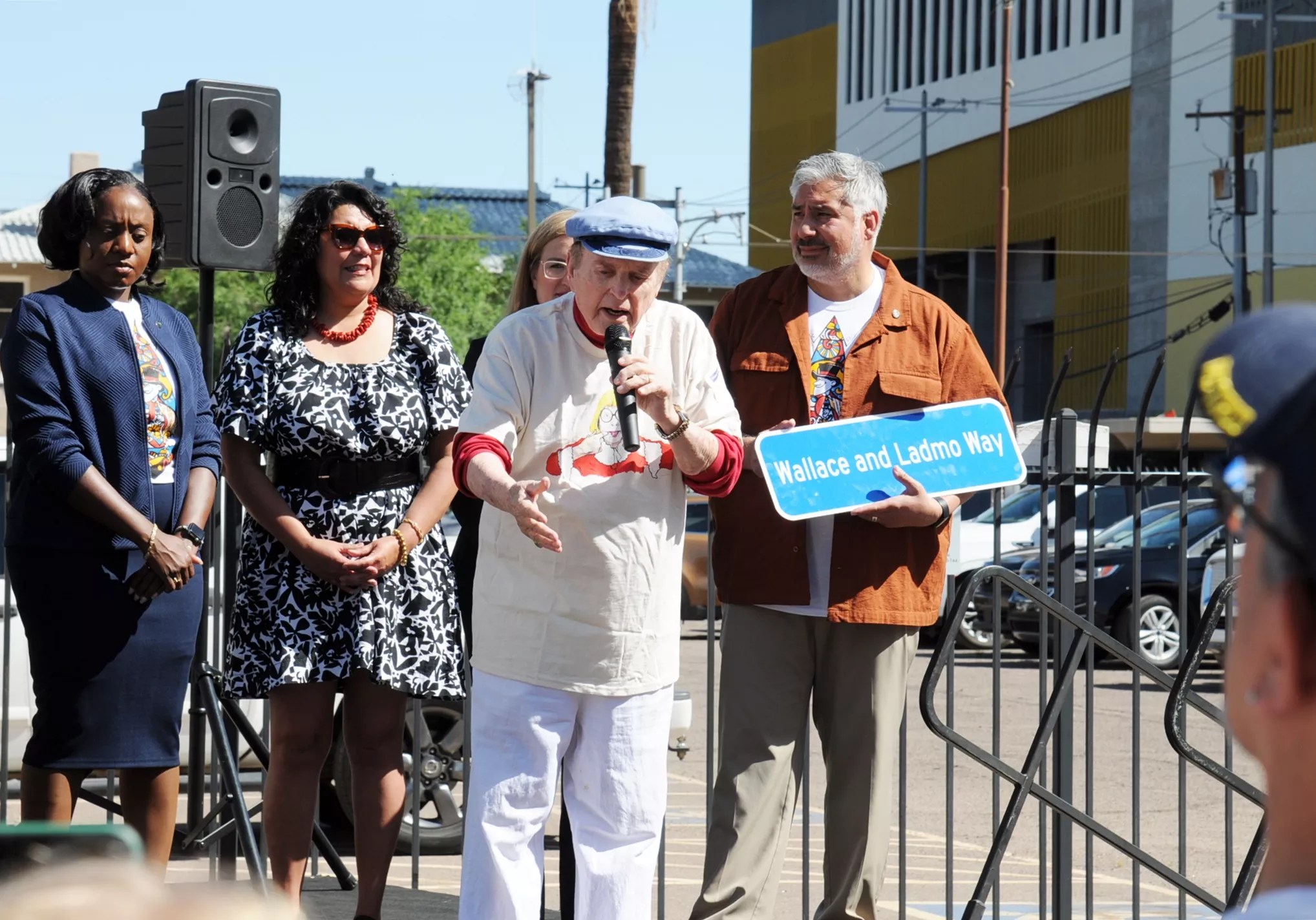 As family members and friends of the duo watched on, Phoenix Mayor Kate Gallego and members of the City Council unveiled “Wallace and Ladmo Way” at the intersection of First Avenue and McKinley Street during a morning ceremony.