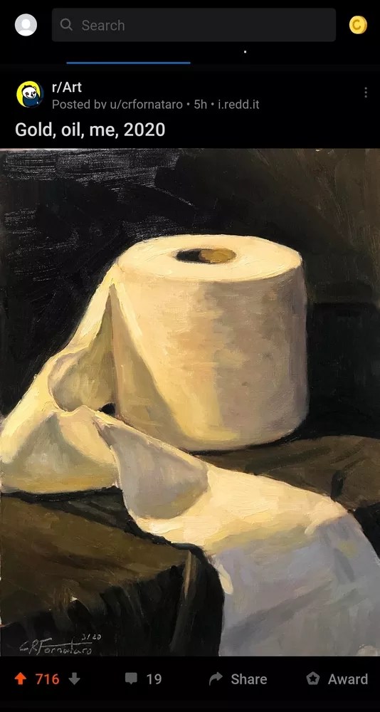 The archive captures a myriad of reactions to the COVID-19 pandemic and its impact on daily life. One entry shows a painting of a gold-tinged roll of white toilet paper, hinting at the way the hygiene product has become a hot commodity in affected areas. Another shows empty shelves lining an aisle in a Mesa grocery store, a phenomenon that’s become familiar in recent weeks.