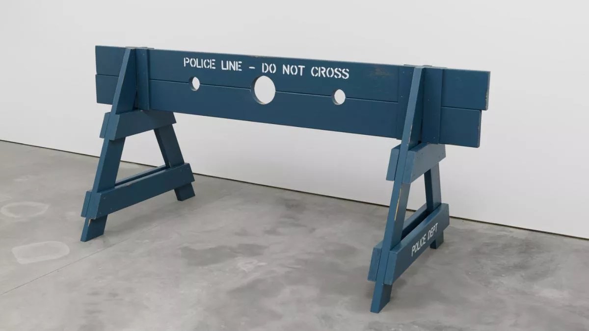 Hugh Hayden, Pillory, 2020. Milk paint on cedar with stainless steel hardware and locks, 44 x 96 x 42 inches.