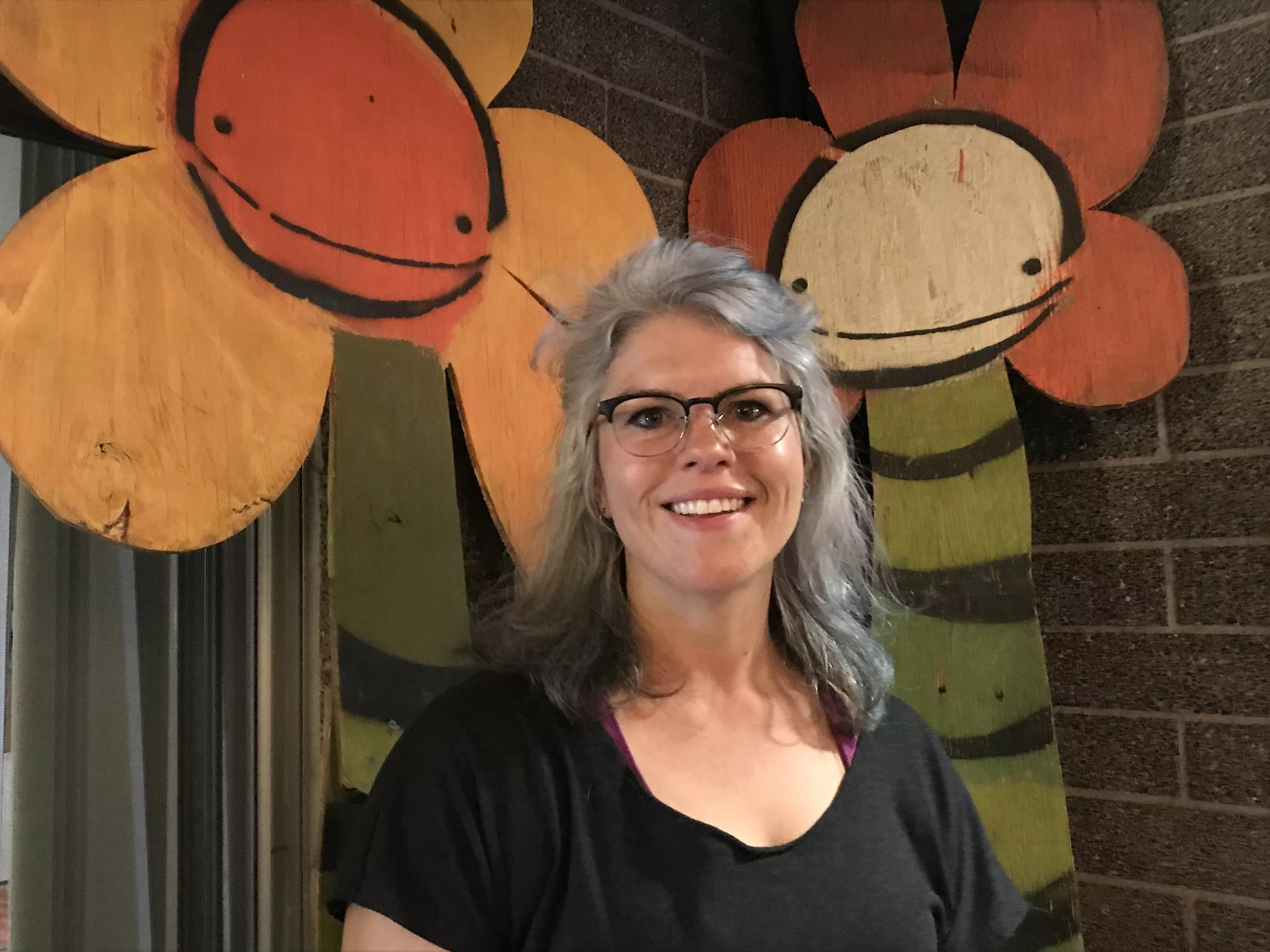 Artist and AZ Burner Kristin Wesley with a pair of her Friendly Flower sculptures.