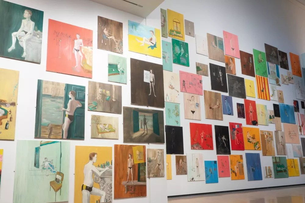 The Visitors is currently on display as part of the Phoenix Art Museum’s “Scandinavian Pain & Other Myths.” It’s one of three pieces on display for the exhibition, the other two being a neon pink sign spelling out, in all caps, “SCANDINAVIAN PAIN,” and Kjartansson’s The End – Venezia painting series. Over the course of the 2009 Venice Biennale, Kjartansson made 144 paintings, a different one each day, with only a friend wearing a Speedo as the primary subject. Hung as a shifting mosaic of colors, the massive piece is a playful contrast to the stately sorrow of The Visitors. Neon colors and cheeky images of Kjartansson’s friend smoking cigarettes and singing “Idiot Wind” fill the wall. It’s a different kind of temporal art, meant to capture one person’s arc over six months.