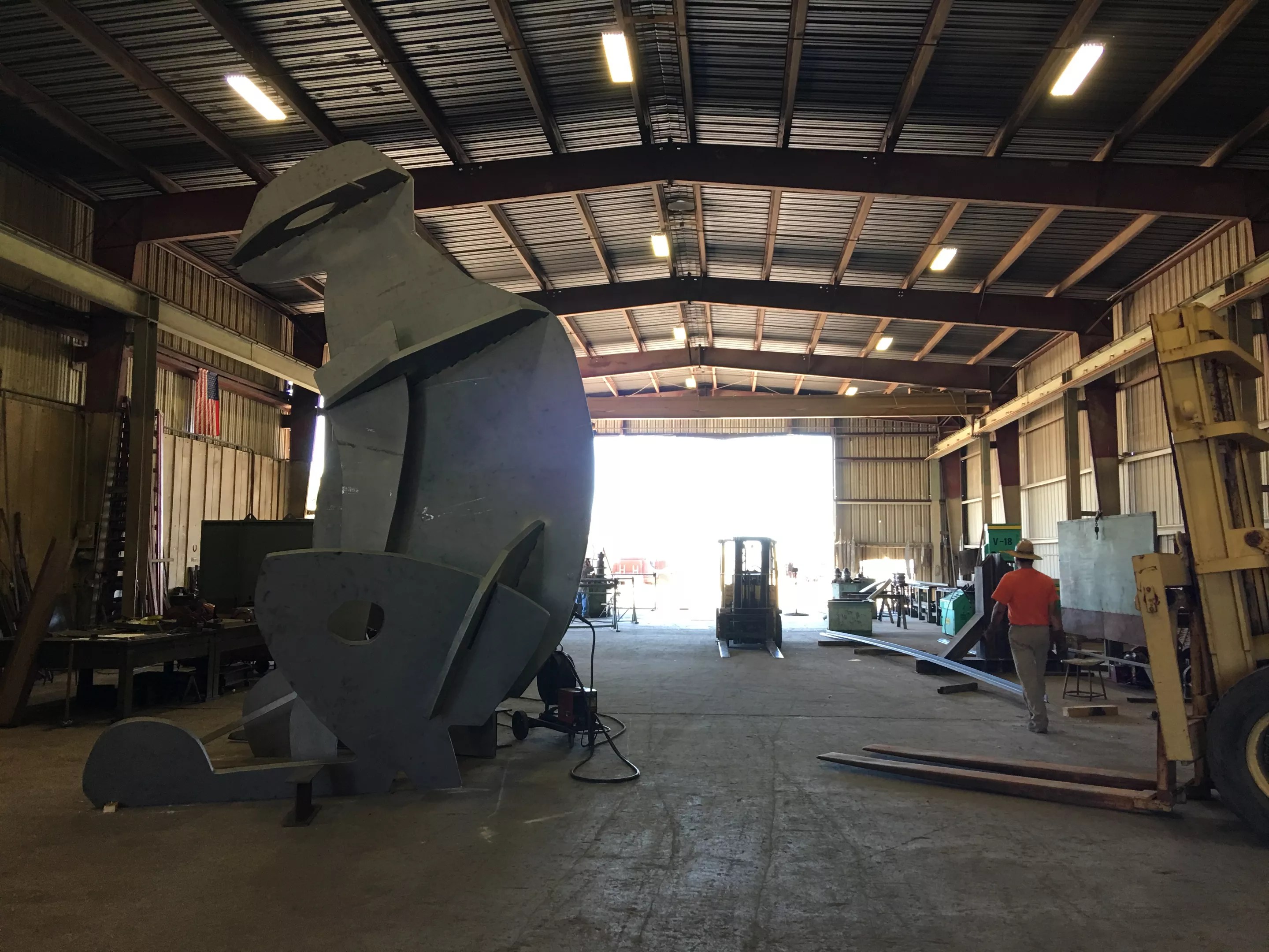 He’d rather focus on finishing fabrication of the piece, started about a year ago after he ordered the giant sheets of steel and began cutting them out.