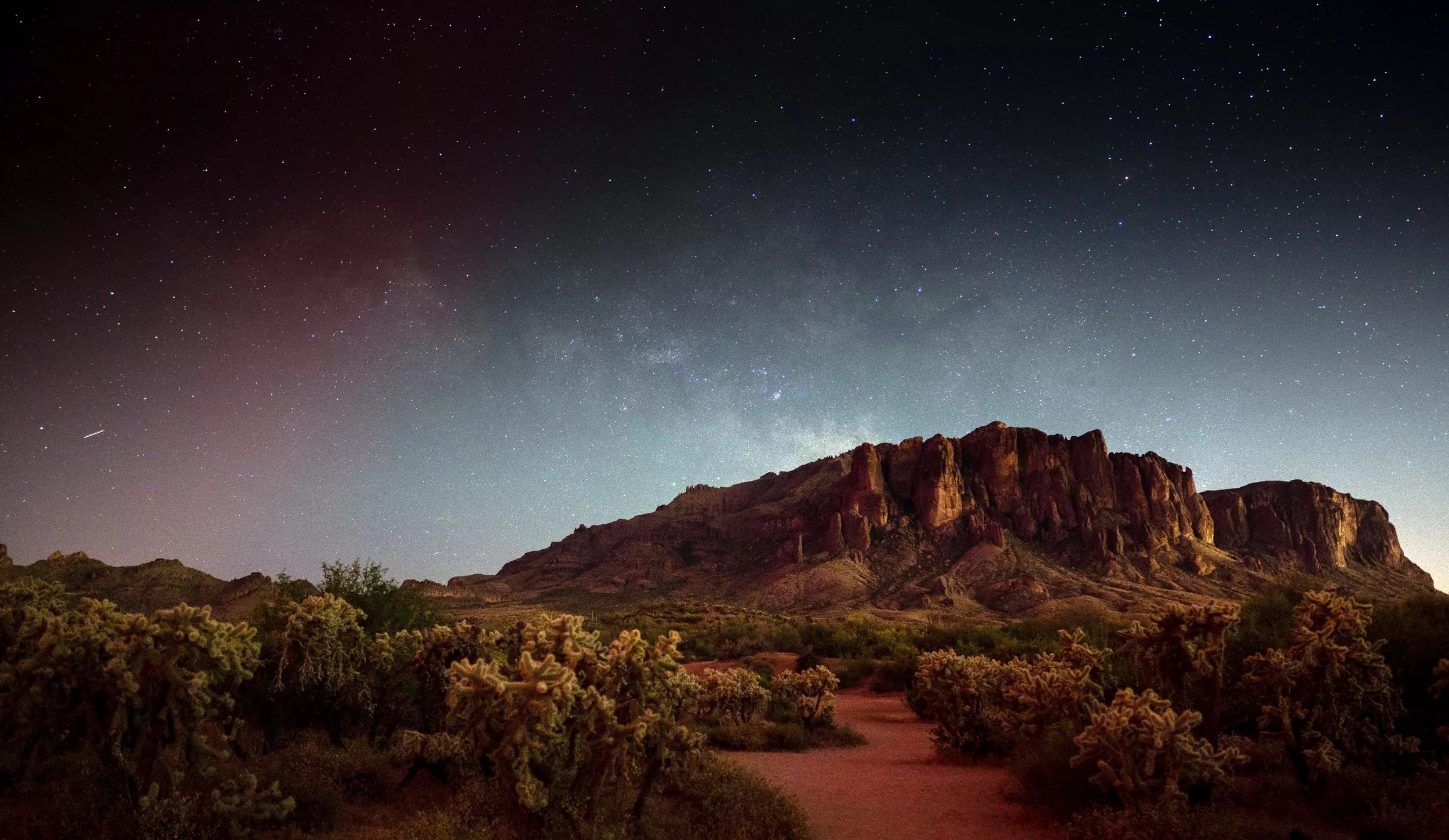 A photo of the northern lights and the Milky Way over the Superstition Mountains.