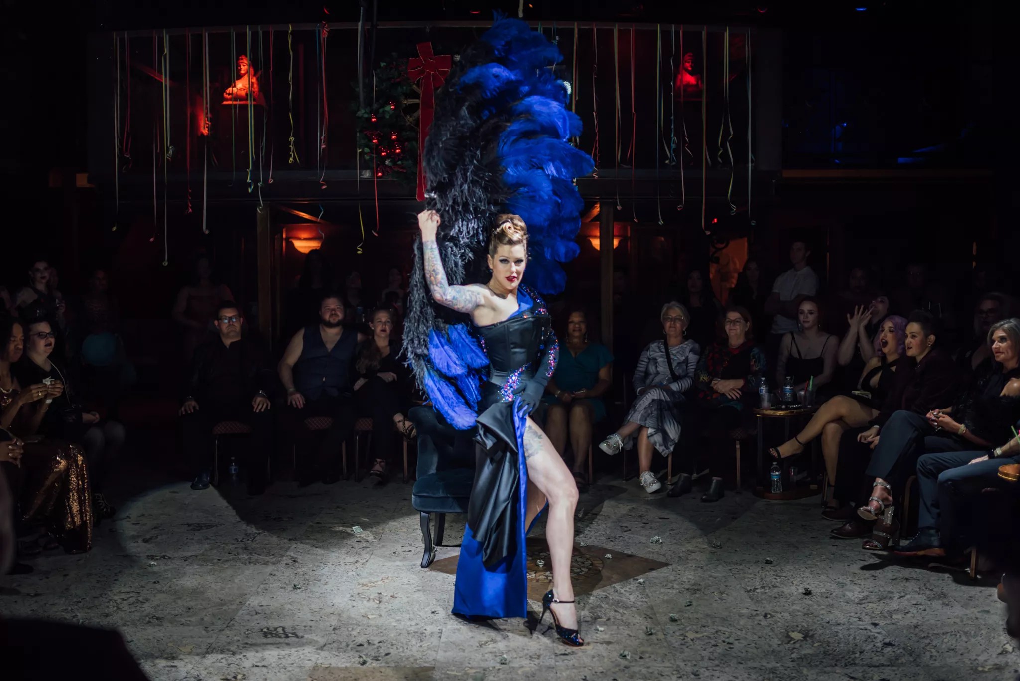 At a tiny cluster of tables and seats, dancers strut and swirl while removing satin gloves, stockings, bustiers, feather boas … and more. Patrons sipping sophisticated cocktails whoop, holler, and clap at the sultry sideways glances, jutting hips, and rotating pastie tassels. Some lucky patrons get draped with the performers’ cast-offs.