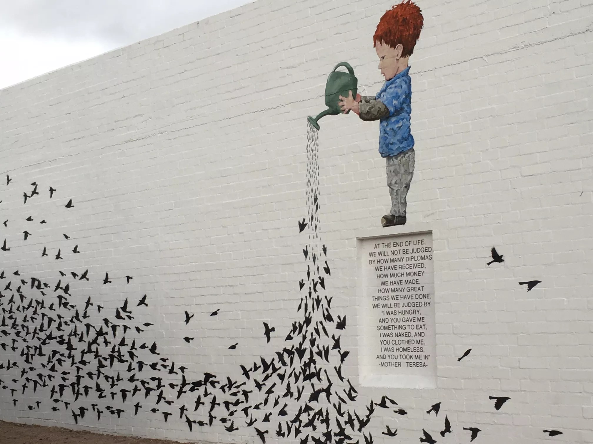The banner covers a mural painted by Phoenix artist Brian Boner, which will be visible again once the Stella Artois banner is removed. Boner’s mural was inspired by a homelessness awareness project called I Have a Name, created by Phoenix artist Jon Linton.