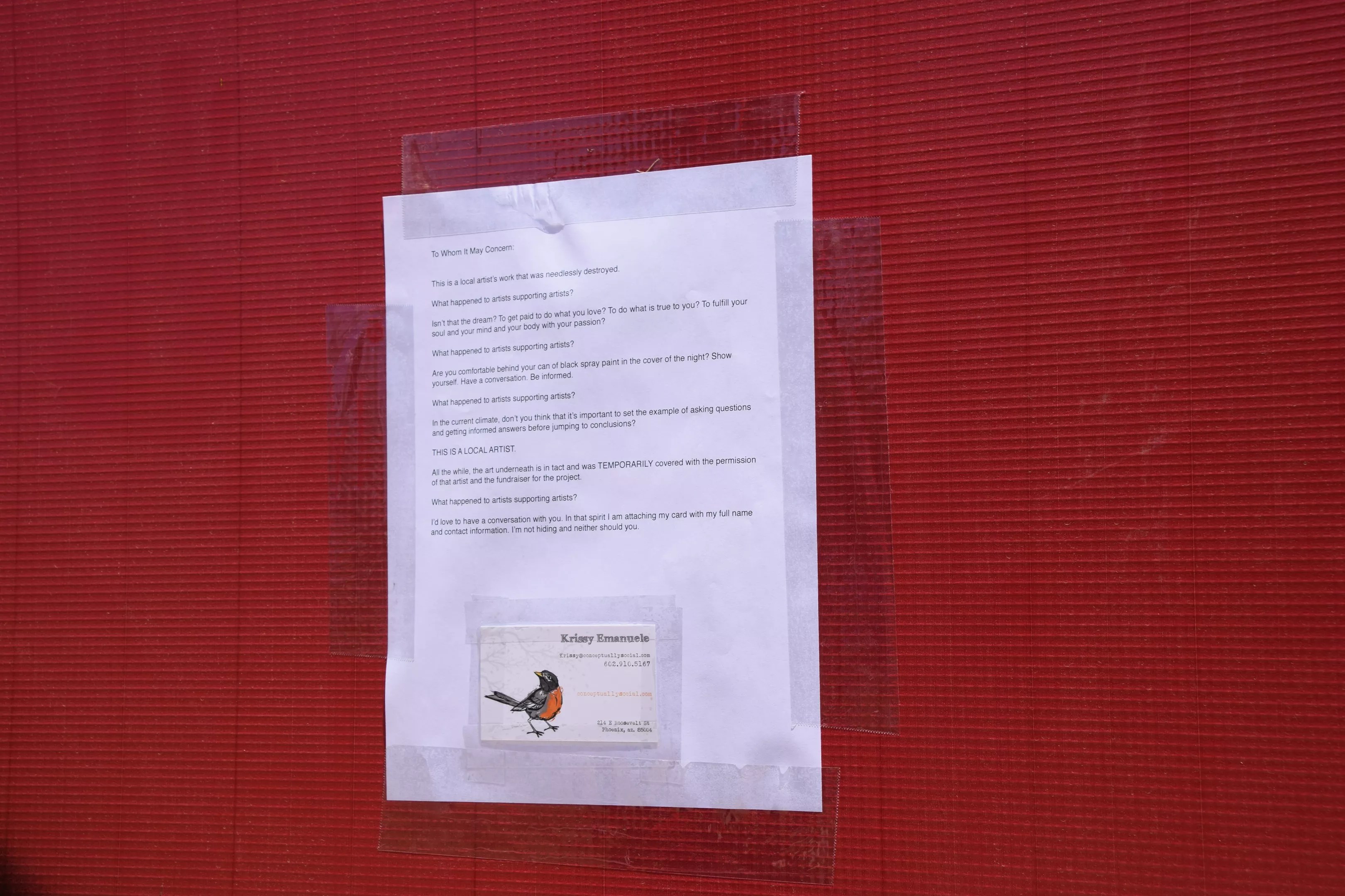 At this point, there are no plans to remove the temporary mural, Rainey says. Instead, he’s thinking of creative ways to paint over the tagging.