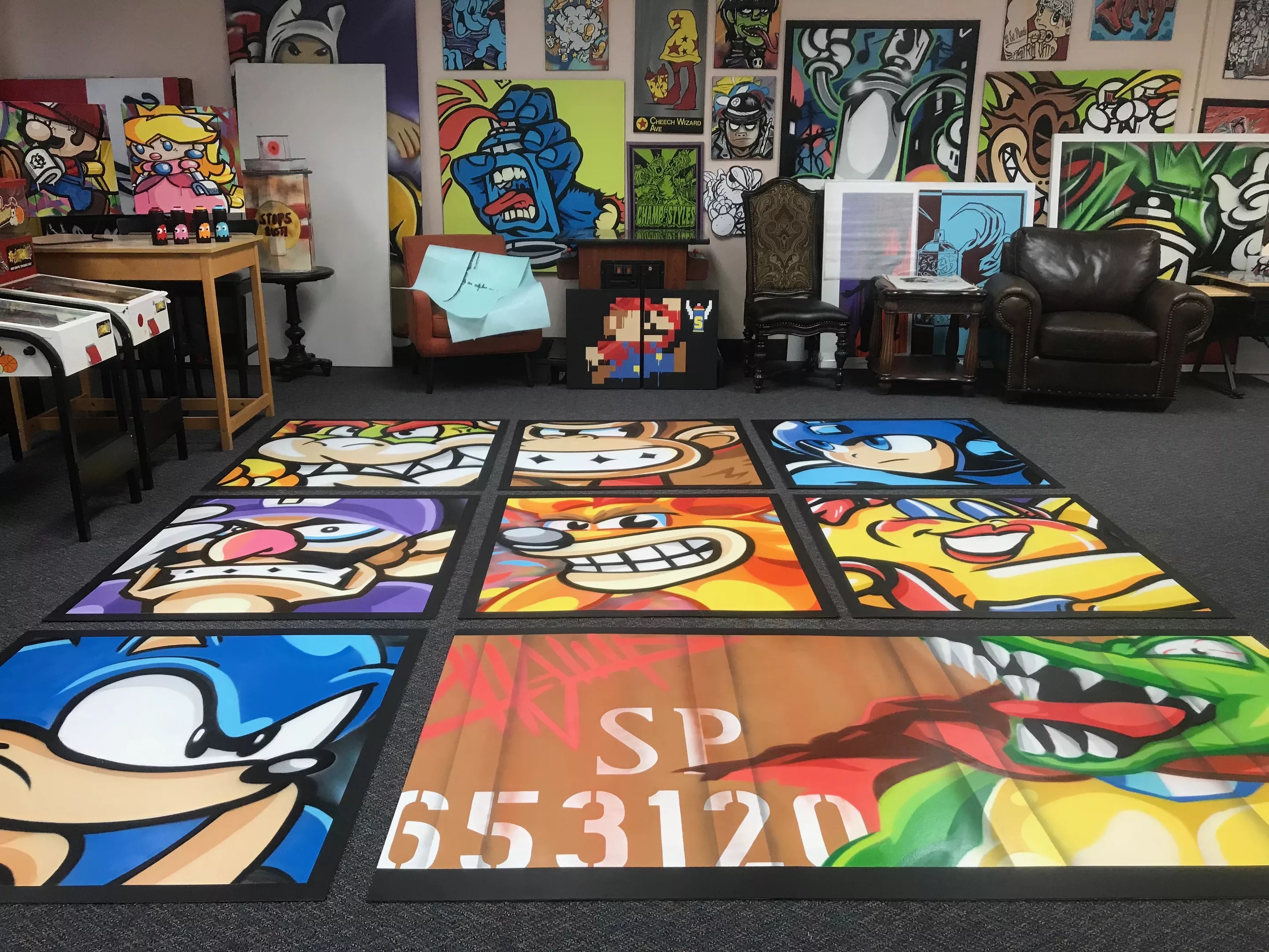 We found the artists laying out the artworks on Valentine’s Day inside a Tempe school where they’re part of an artist residency program. Seven portraits of best-loved characters lay on the ground in a grid along with another painting that references graffiti culture and train cars.