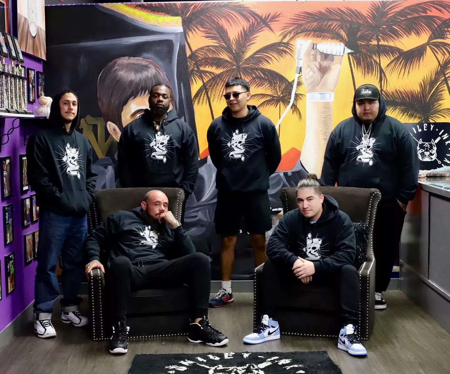 Valenzuela continues, “Smiley and Daniel [another artist at the shop] will compete for best tattoo of the day. Smiley will do a Disney leg piece, and Daniel is working on a portrait with custom lettering.”