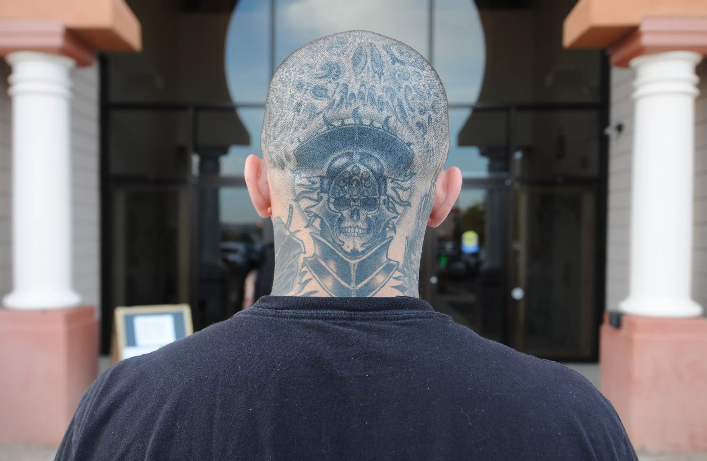 A fierce-looking head tattoo spotted outside of the Phoenix Shrine Auditorium.