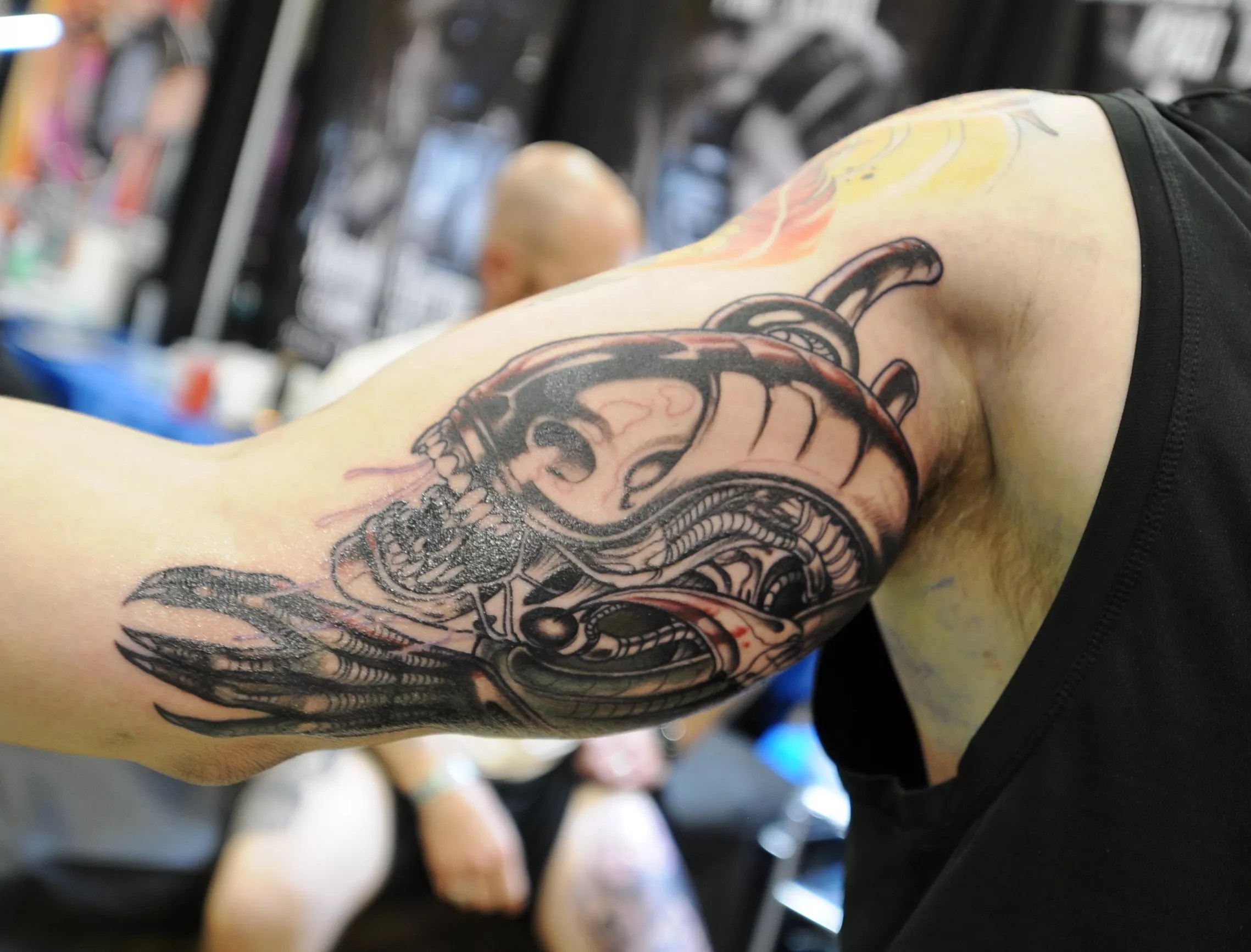 Joe Benson of Gilbert shows off a tattoo of a xenomorph from the “Alien” films by Lindsey Dorman of Cobra Kiss Tattoo in Mesa.