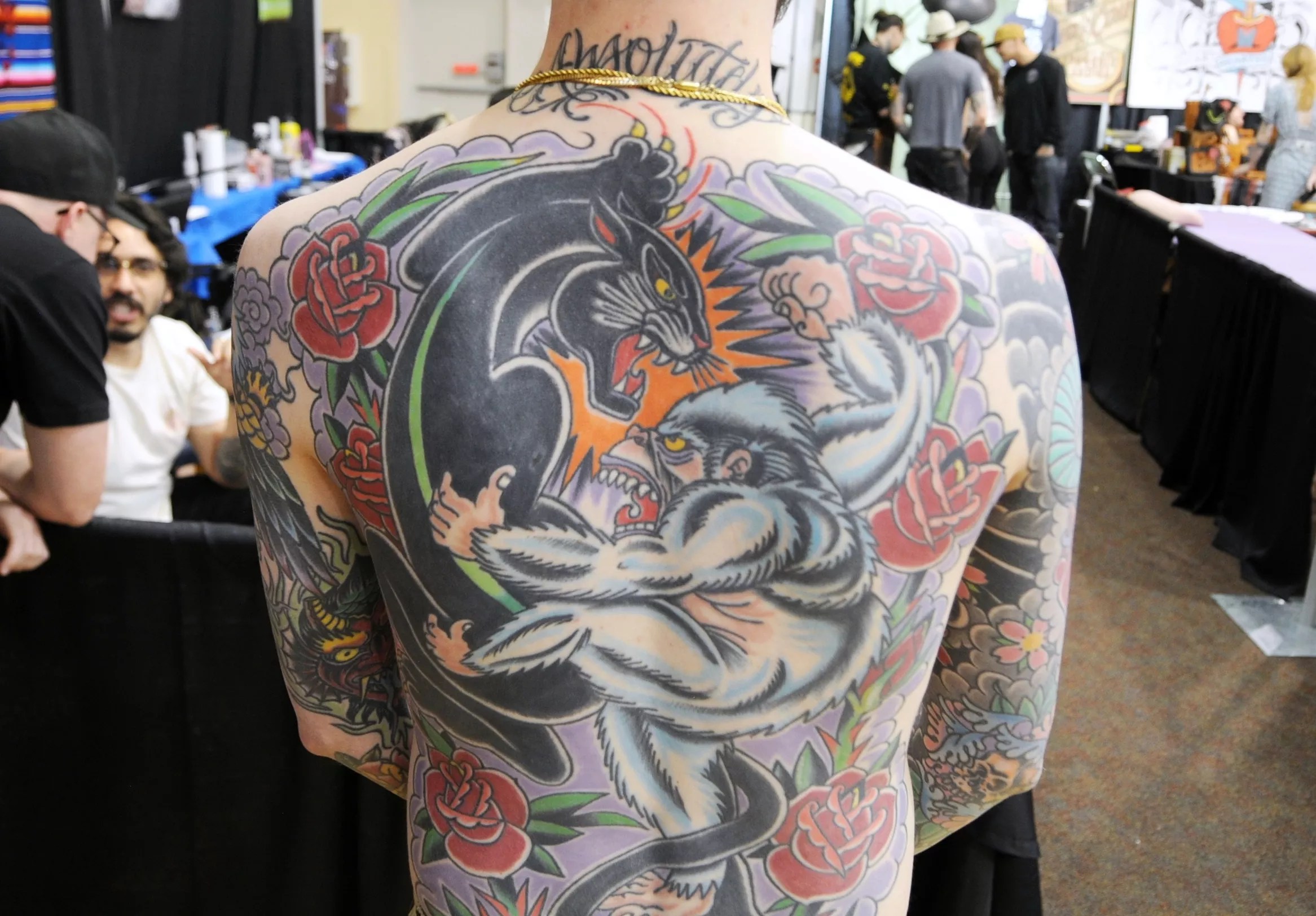 An epic battle takes place on the back of Casey Harvill of Mesa. It was created by artist Aaron Coleman of Immaculate Tattoo in Mesa.
