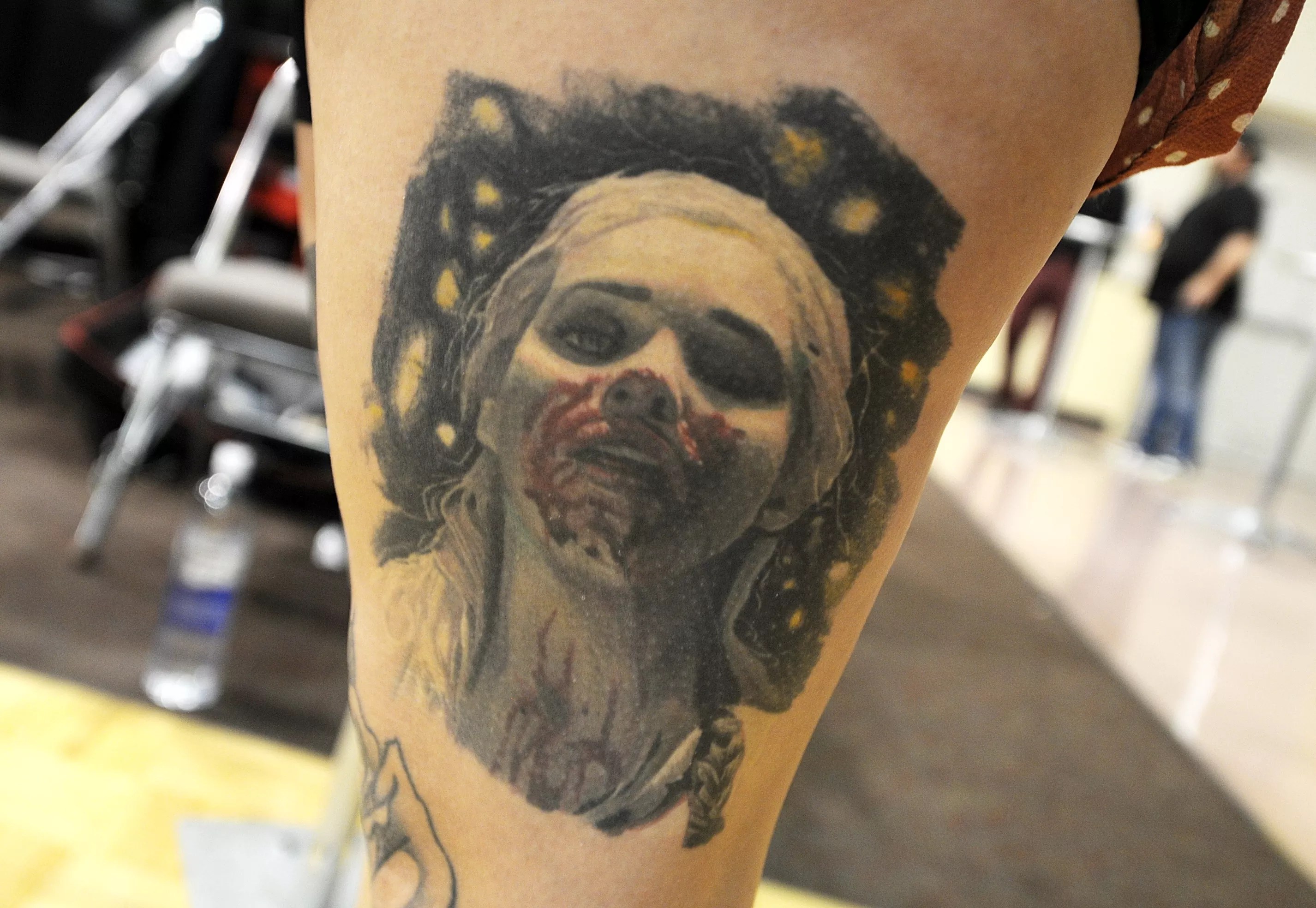 A tattoo of the “Mother of Dragons” (a.k.a. Daenerys Targaryen from “Game of Thrones” by Oakland artist Bretty Baumgart.