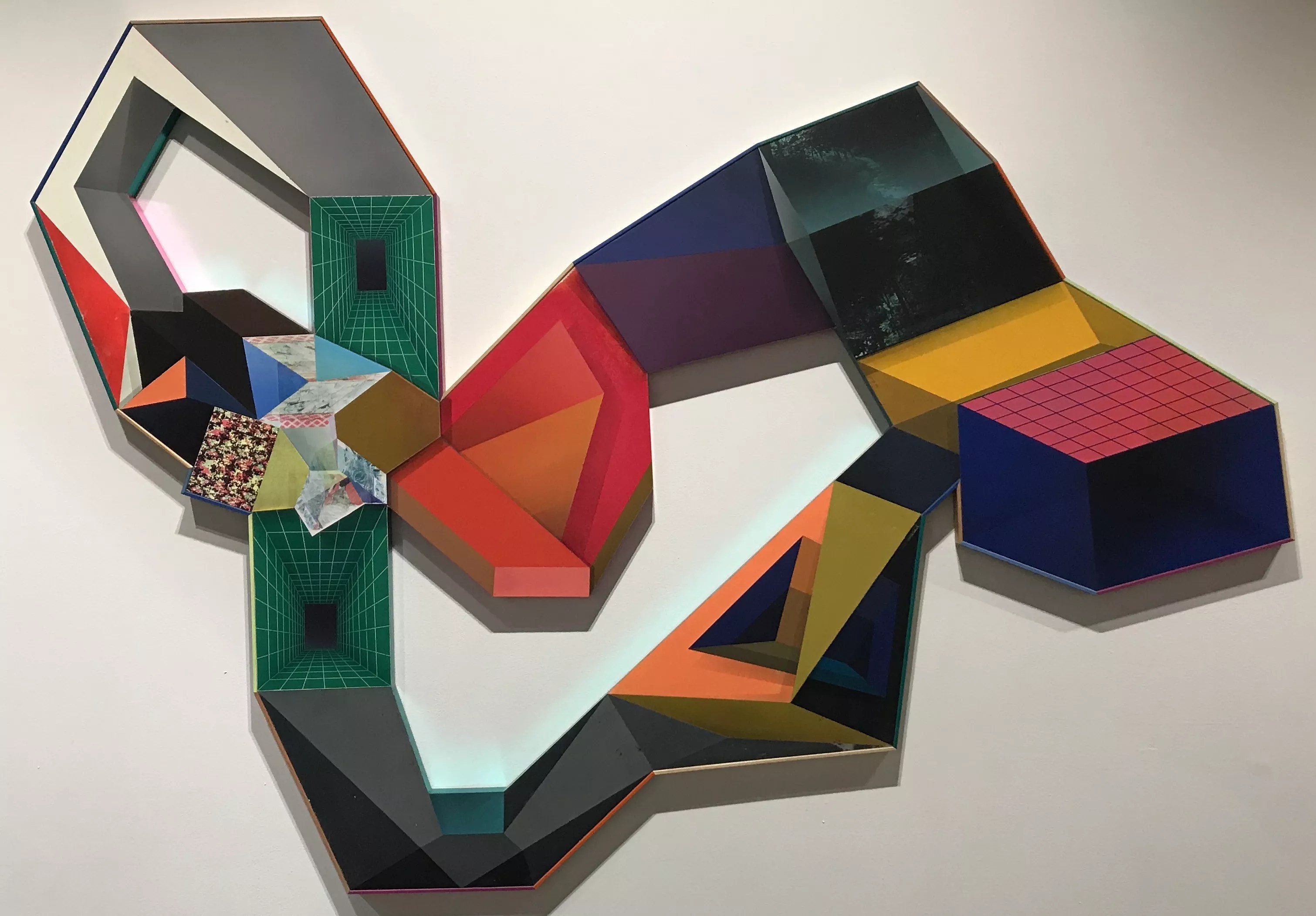 The exhibit features works by Mike Jacobs, who blends deconstructed photographic imagery with painted geometrics to explore visual culture, technical systems, and scientific paradigms that shape perception. It also includes works by Travis Rice, who uses paintings, drawings, and sculptures heavily influenced by architectural perspectives to explore motifs prevalent in Southwestern landscapes. The show continues through November 9. Lynn Trimble