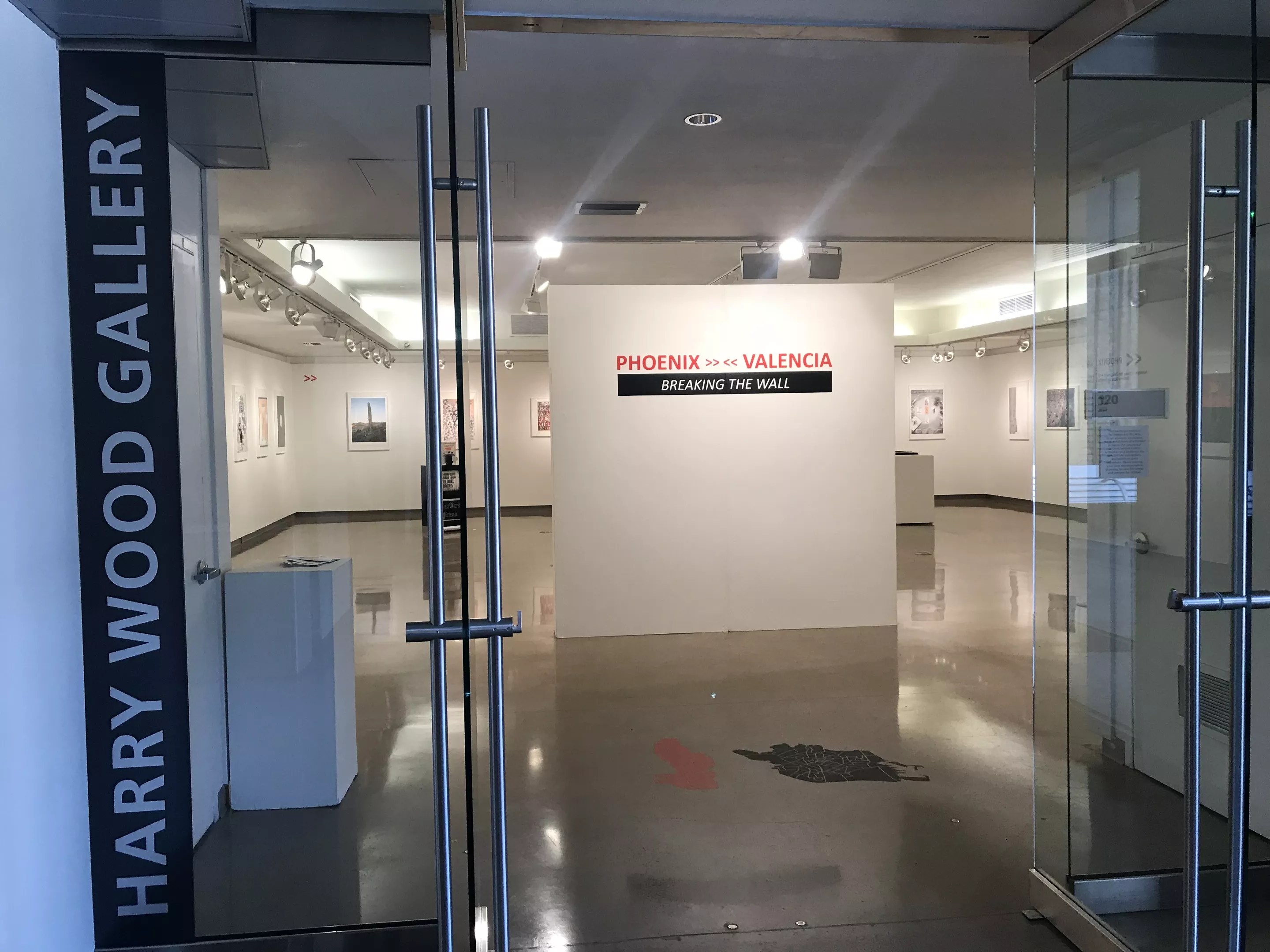 Walking through open gallery doors at ASU School of Art.