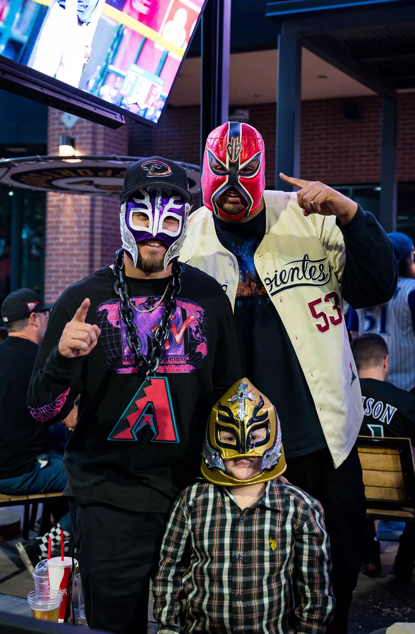 Geoffrey Pixley, Orlando Barrera and Tommy Shorr don their D-backs luchador masks at a World Series watch party outside Chase Field.