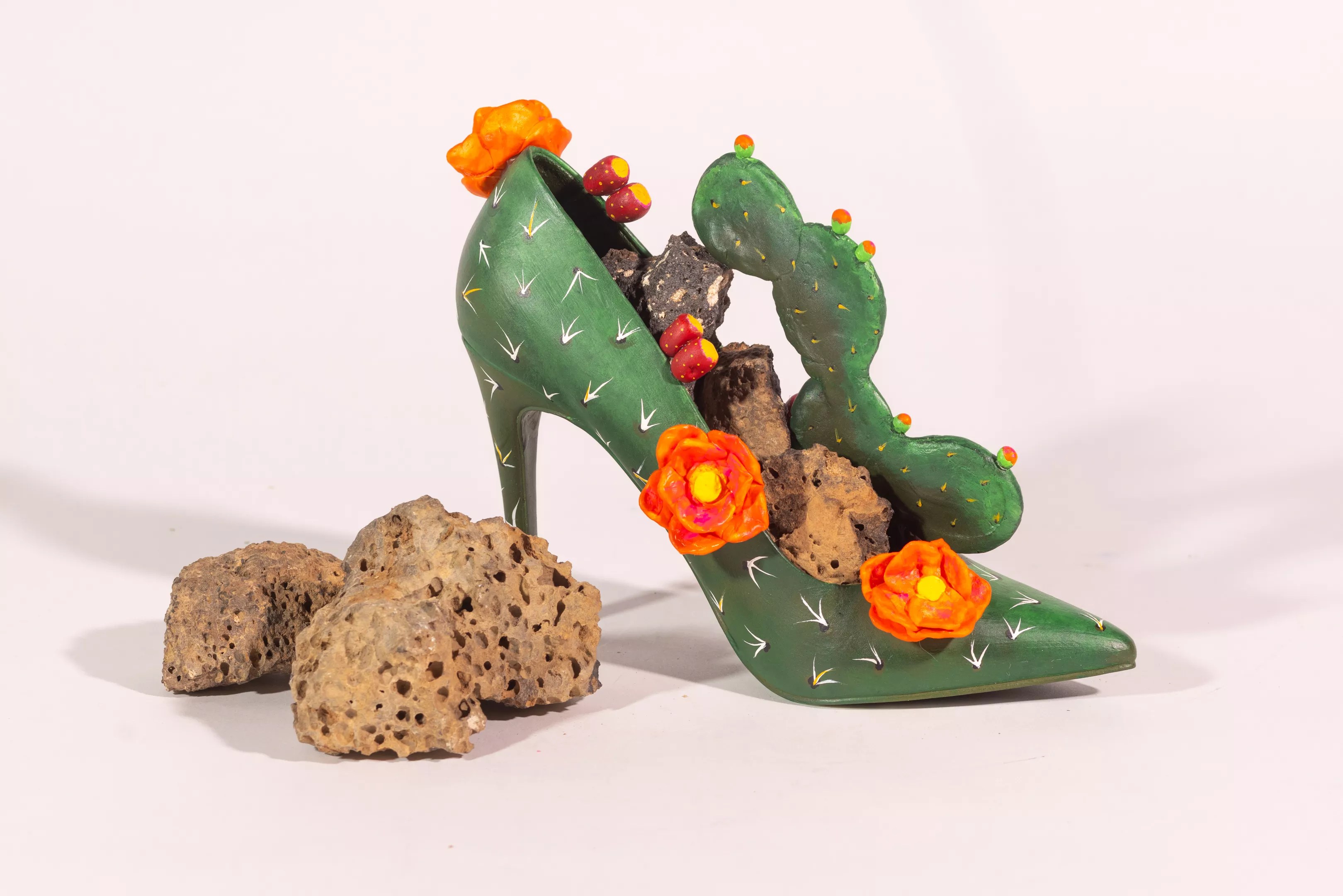 Another important aspect of the show to Torres is the diversity within the art. Each of the 100 artists started with the same black pair of stilettos. From there, they had full creative freedom to design the shoes. The heels all have various themes, like “Hasta la Raiz” by Rebecca “Becky” Ibarra, which Torres described as a personal favorite. The piece is described as a dedication “to all the Chingona women throughout our ancestral DNA. Like Mother Earth, we blossom through all hardships and continue to nourish our families and communities.”