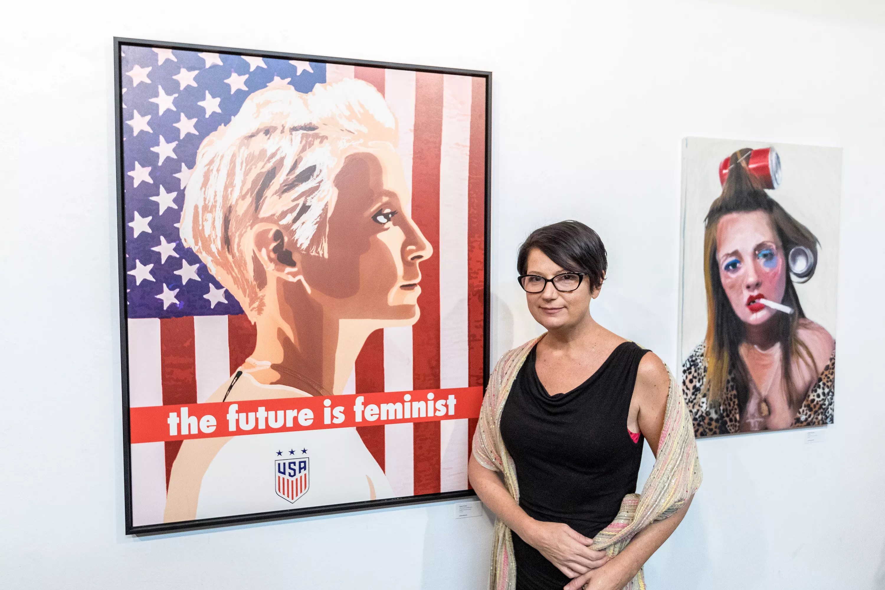 California artist Karen Fiorito with an artwork that helped to inspire her new billboard design.