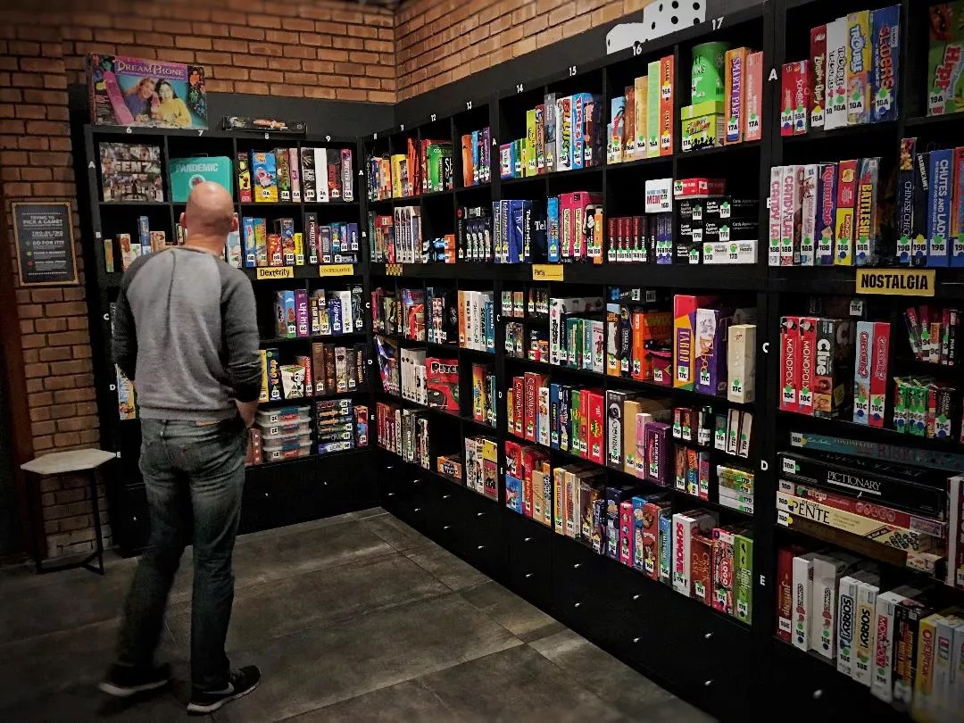 She pointed to a wall of colorful boxes nearly twice as tall as she. “There are so many games here! Deciding what to play can be a lot!”