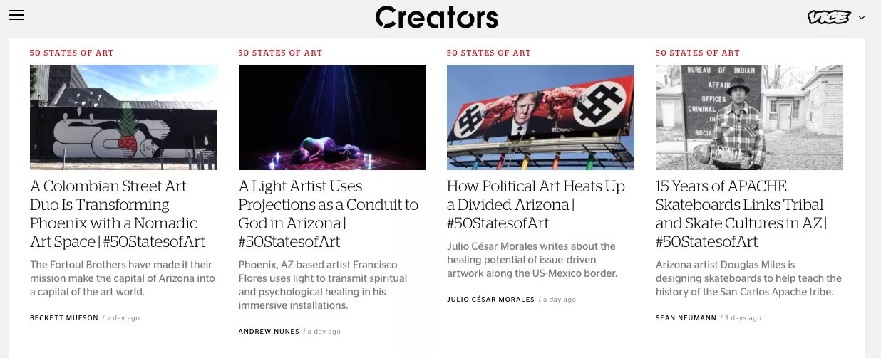 It was a few days ago that we first saw pieces from your 50 States of Art series circulating on Facebook. We thought: Oh, that’s cool. You guys are taking a closer look at artists across the country for the project. That’s no small undertaking. Much respect.