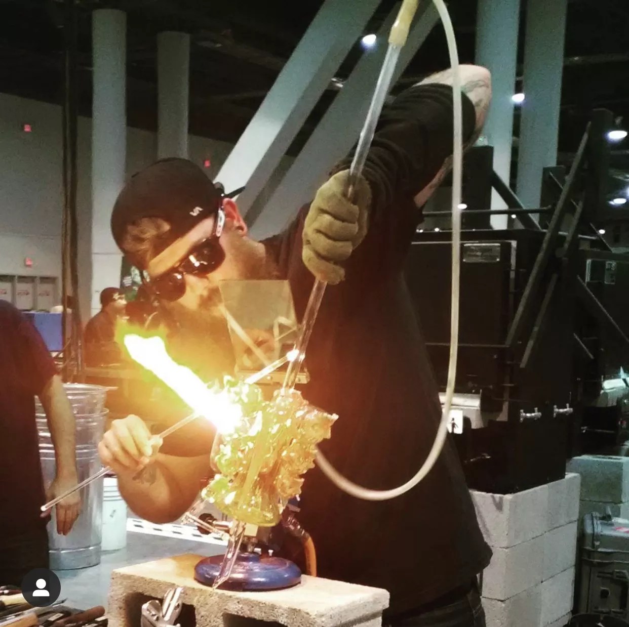 “I was really athletic in high school, and I never pictured myself being artistic,” he recalls. Henderson was working in an aquatics shop the day he met a glassblower who was looking for an apprentice. At first, Henderson made small fish and coral figures. Now, he makes elaborate pipes that sell for several thousand dollars.