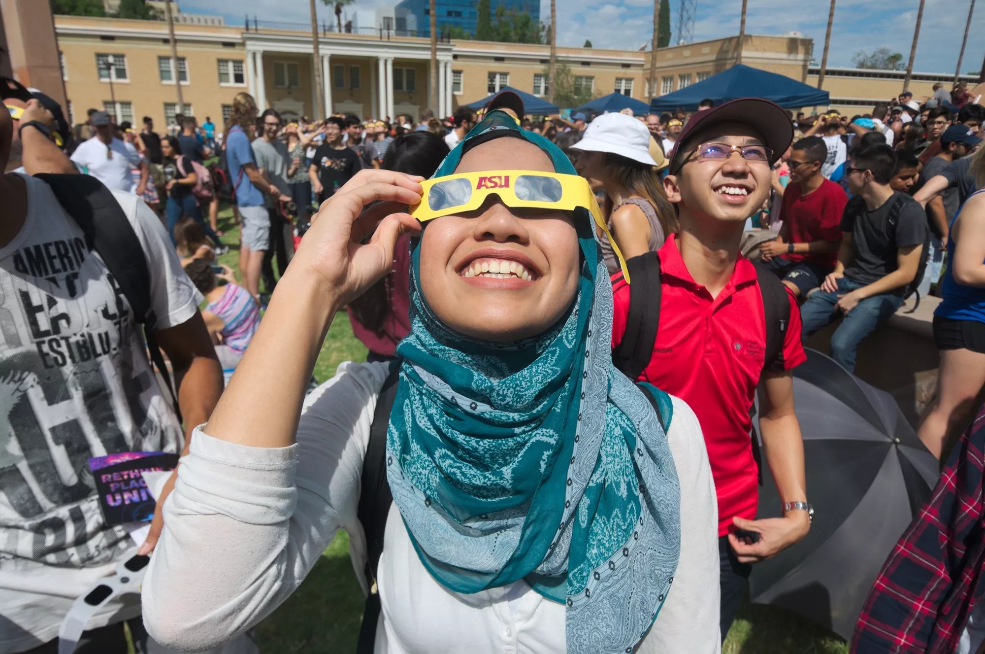 A local family watches the eclipse at Arizona State University in Tempe during the 2017 solar eclipse.
