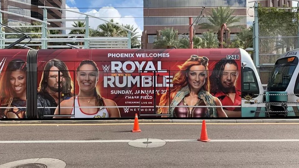 A Valley Metro light rail train celebrating the Royal Rumble in Phoenix.