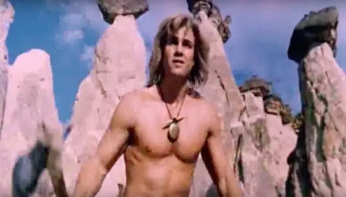 An Italian production shot mostly in Turkey, among the weird, unearthly rock formations of Cappadocia, this relic of the big-hair-and-wine-cooler decade features an American leading man. USC running back turned action star Reb Brown plays Yor, a smiling blond hero in a loincloth, wandering a strange primordial world of cave people and terrifying monsters. In the opening scene, he cheerfully rescues a gorgeous cavewoman and her grizzled guardian from a rampaging “stegoceratops” (or maybe it’s a “triceragosaurus”) – in any case, it has both three horns on its face and plates running down its back. He kills the clunky beast, then sips its blood, noting, “The blood of your enemy makes you stronger.”