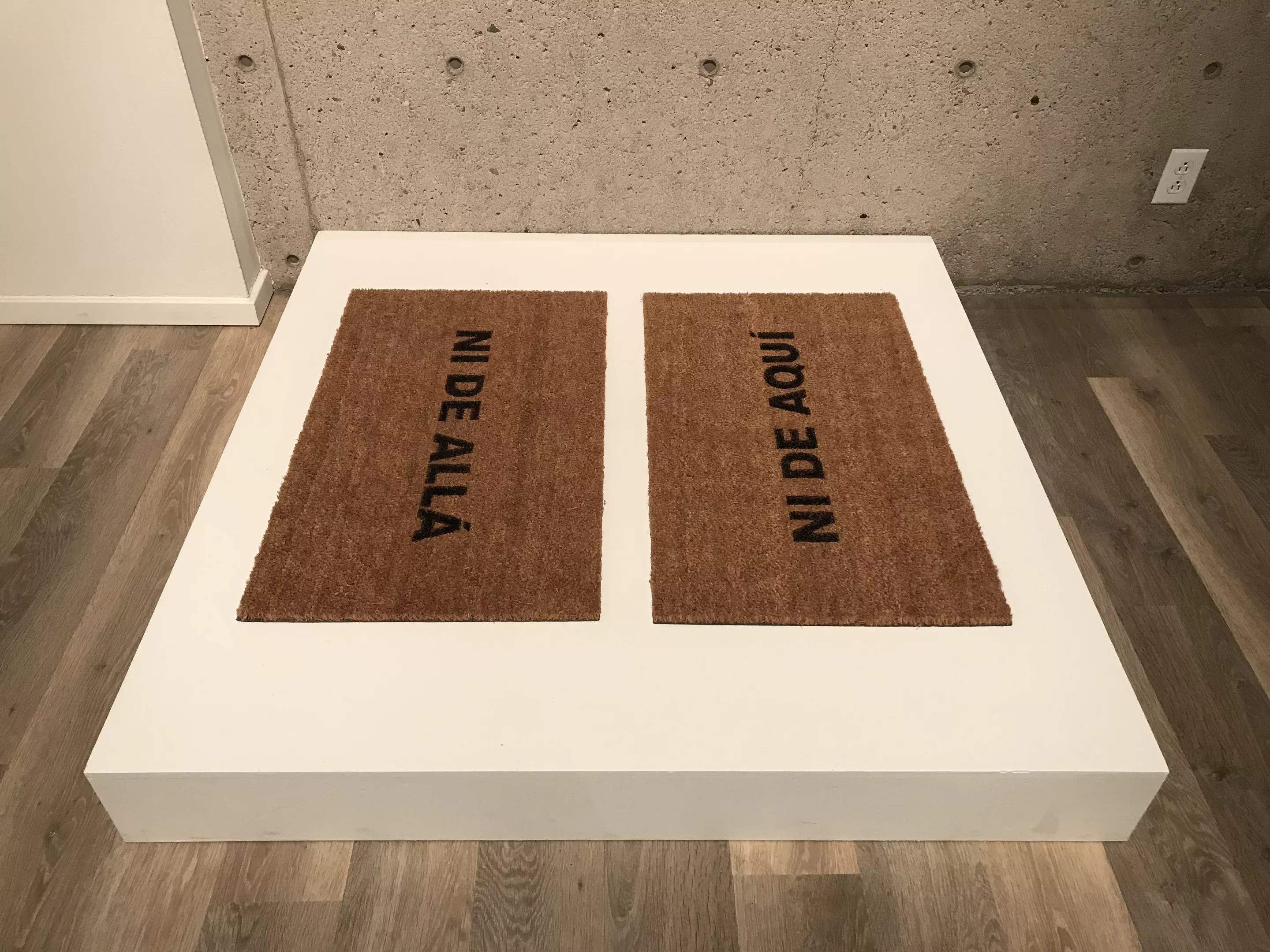 Another Tucson artist, Karlito Miller Espinosa, addresses the lack of belonging felt by migrants, refugees, and Dreamers, with a pair of welcome mats called Untitled (Deferred Action), created in 2016-17. Using acrylic and shoe polish, he’s altered coir coconut fiber mats using Spanish phrases that mean “neither from here” and “nor from there.” Written in the Akzidenz-Grotesk font of Donald Trump’s 2016 campaign materials, the artist calls out Trump’s use of “otherness” to foster fear of immigrants.