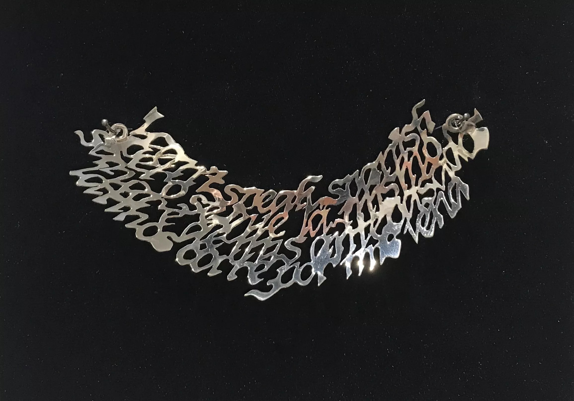 Nearby, there’s a small piece of calligraphic script cut from sterling silver. Created by Gilbert-based Samantha Frésquez and Phoenix-based Merryn Alaka, La Misma (2018) features verse from an Audrey Ruiz poem titled But, which addresses American Latinos who don’t speak Spanish.