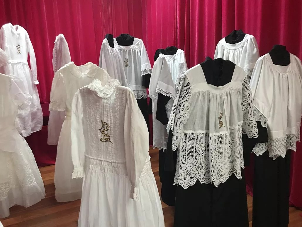 Trina McKillen, The Children, 2015-2018, 20 communion dresses, 20 altar boy vestments, Irish linen, thread, gold leaf, dimensions vary.