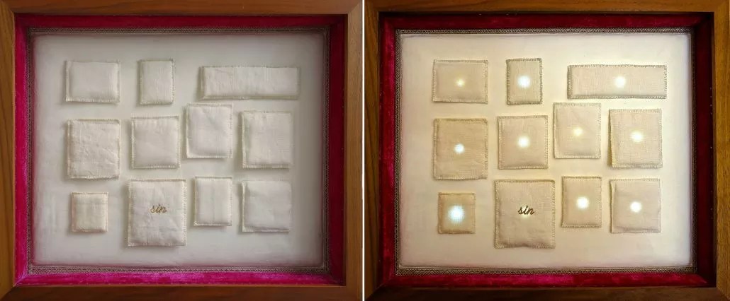 Trina McKillen, Stations of Hope, 2008-2013, 14 pieces, linen, thread, nails, velvet, metallic ecclesiastic ribbon, embroidery, lights, dice, miniature plastic sheep, wood, dimensions vary.