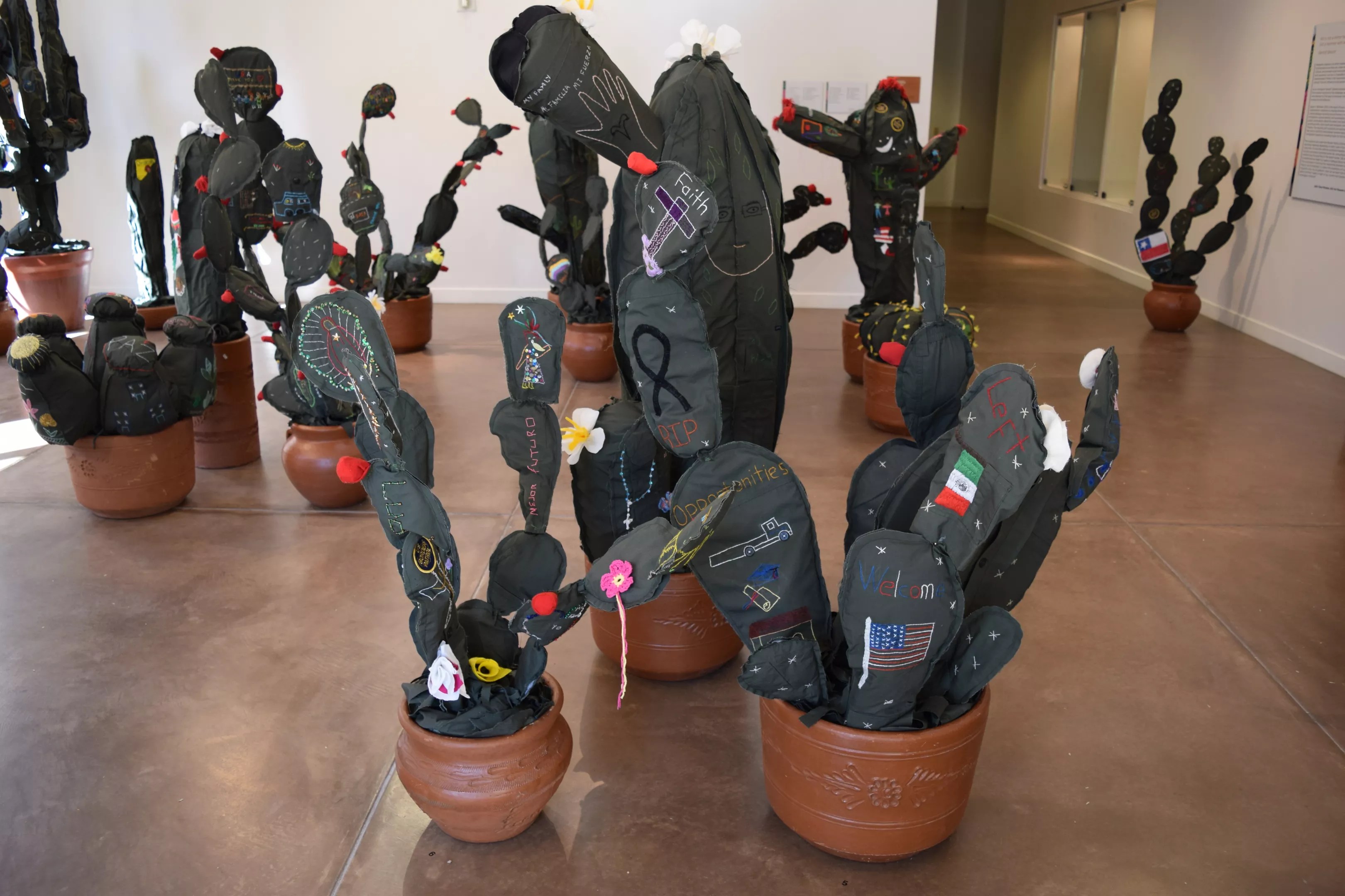During a September 2015 artist residency with ASU Art Museum, Margarita Cabrera worked with community members to create soft sculptures with an immigration-related twist. About 30 people, including many immigrants, worked with Cabrera to create saguaro cactus sculptures made of Border Patrol agent uniforms. Every cactus was also decorated with words or images taken from stories of actual immigrant experiences. ASU Art Museum collaborated with the Desert Botanical Garden, which showed the works in an exhibition titled “Margarita Cabrera: Space In Between.” Cabrera has since joined the faculty at ASU School of Art, and her work is part of the ASU Art Museum collection.