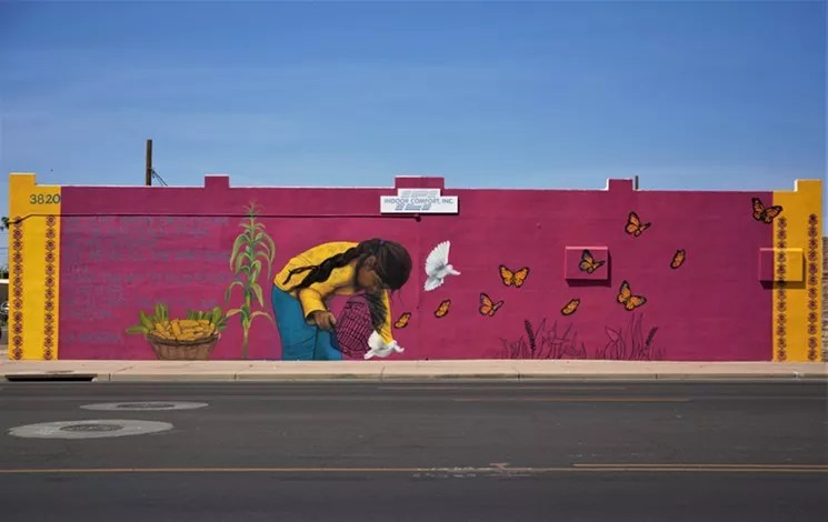 One of Phoenix’s best-known and prolific muralists, Lalo Cota was born in Navojoa, Sonora, Mexico. He’s one of several artists who collaborated with the Tucson-based Colibri Center for Human Rights on a 2015 mural raising awareness of migrant deaths in the desert borderlands. But he’s also painted several works that reference the “illegal alien” language of former Maricopa County sheriff and Trump pal Joe Arpaio. Those works feature surrealist images of sombreros stylized to look like flying saucers hovering over desert skies. One of Cota’s best-loved murals painted many years ago on a car wash in Roosevelt Row, has since been demolished to make way for a new Starbucks. But fans can see more of Cota’s work inside the Roosevelt Row gallery and studio space he opened in early 2018.