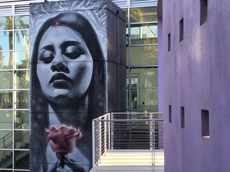 That beautiful mural you see off a Mesa Arts Center courtyard features the image of Karen Bracamonte, an immigrant from Guatemala married to one of the artist’s closest friends. El Mac was born in Los Angeles, where he lives today, but grew up in Phoenix, where friends know him as Miles “Mac” MacGregor. The aerosol artwork painted in 2016 was commissioned by Mesa Contemporary Arts Museum. It features Bracamonte, then seven months pregnant, holding a single red rose. El Mac collaborated with Mesa artist Mando Rascón on the designs at the top of the mural, which he titled Desert Rose (Nuevas Generacioners). And he wrote these words about the mural on his website: “I was honored to paint for this museum something that can hopefully be seen as beautiful and affirming of love, life, and diversity.”