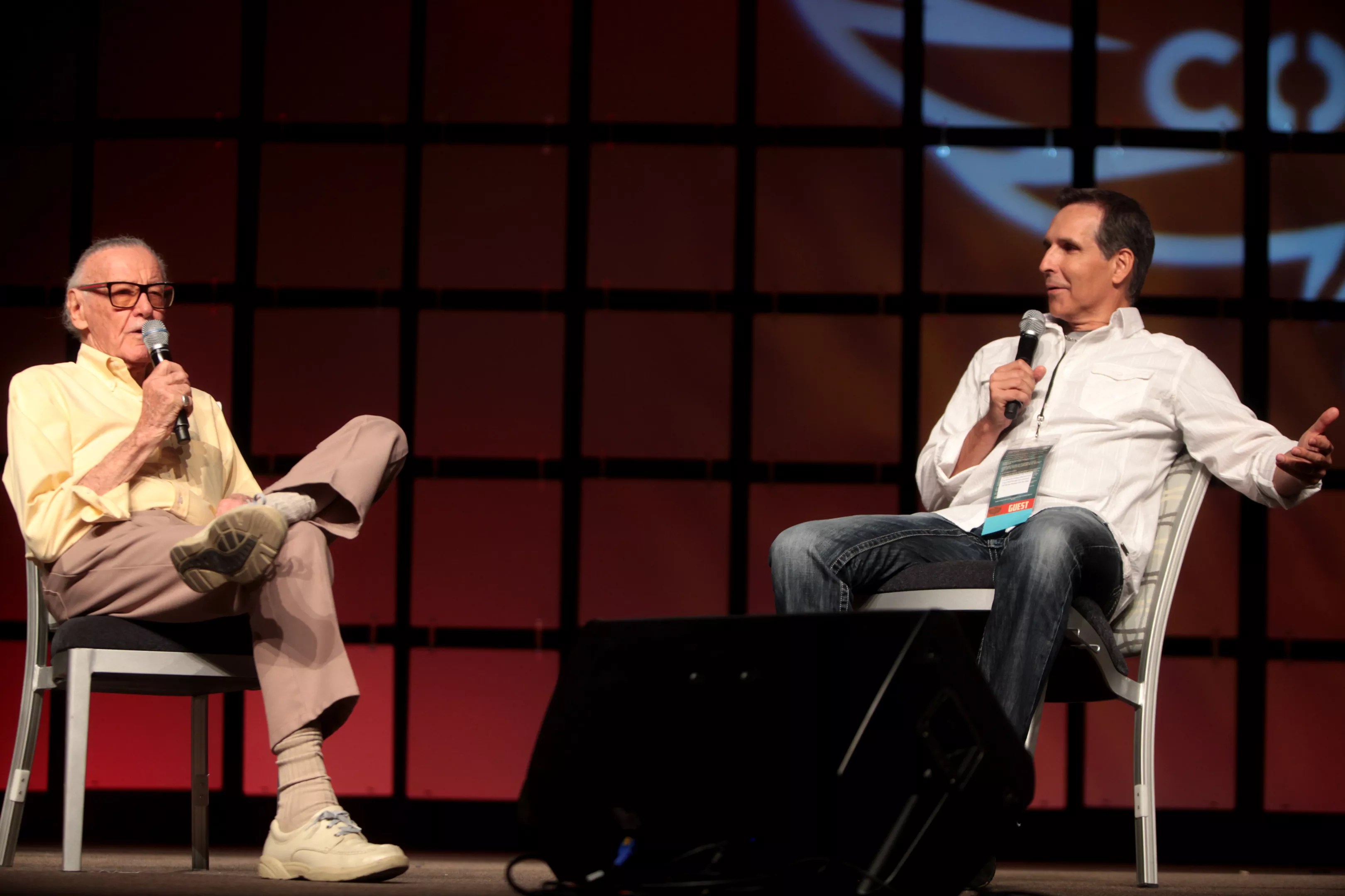 Todd McFarlane (right) emcees a panel for Stan Lee (left) at Phoenix Comicon in 2014.