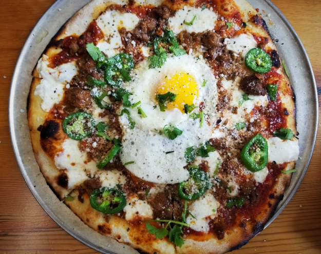 Come for the breakfast wine, stay for the Merguez sausage pizza.