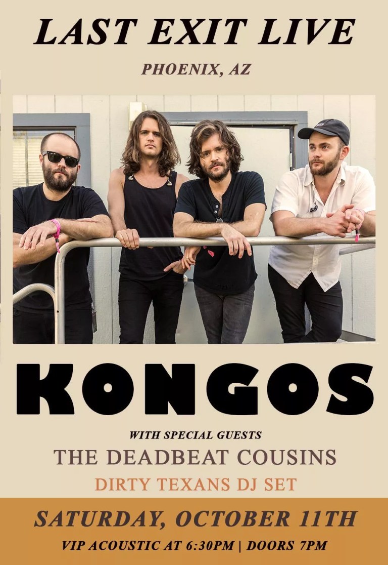 KONGOS When: Sat., Oct 11, 8:00 pm Where: Last Exit Live Tickets: $35.17-$88.66 | Get Tickets With The Deadbeat Cousins & Dirty Texans Eventbrite advertisement