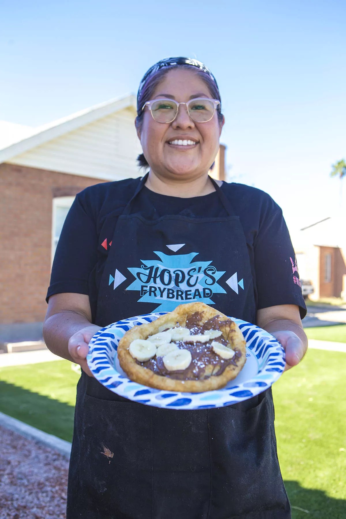 Owner Hope Peshlakai first started selling Navajo tacos as way to raise money for a neighbor. Using her grandmother’s signature recipe, she placed beans, lettuce, cheese, onion, and tomato on a deeply browned, chewy frybread. After 10 years of selling her food at a roadside stand, Peshlakai is hoping to have her brick-and-mortar location open in March, just south of Main Street and Mesa Drive. Peshlakai and her husband, Aaron, also serve their food to the masses on certain pop-up days in the downtown Mesa area. There you’ll find frybread in many forms, from the Asian Persuasion chicken teriyaki sandwich to the double-patty burger sandwich with cheese, and s’mores. Peshlakai previously told Phoenix New Times that she wants her new restaurant to be a place to share stories, culture, and family recipes with customers, so they’ll feel like they’re eating at home or at a best friend’s house. We can certainly envision that.