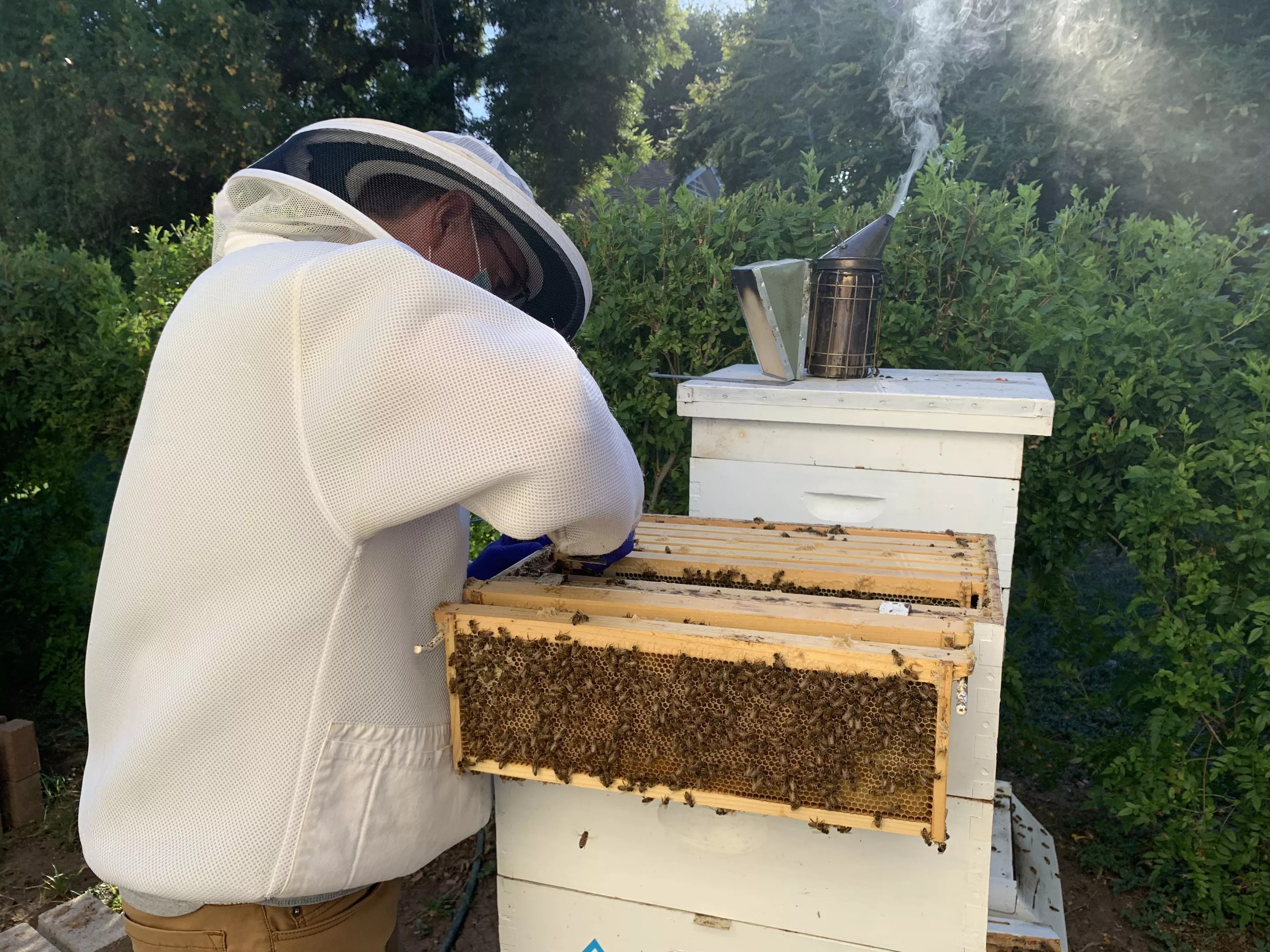 On a recent visit, the bees were behaving themselves. Just below the lid, there’s a rectangular mesh frame. He gives little puffs over the mesh and opens it as he gently talks to the bees. “Hey girls, how are we doing today?” He visually examines the bees for Varroa destructor, a parasitic mite that can destroy hives.