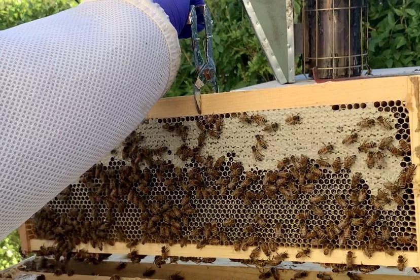 Rawls also inspects the health of the hive and the broods, which he refers to as “baby bees.” To achieve this, he has to physically break the seals of the propolis (or bee glue) and remove a few frames, though not any propolis. Propolis helps the structure of the hive and seals it from, say, ants. Since this process is disruptive to the bees, he only does it on these visits. Thus, the bees only have to redistribute it rather than remaking it.