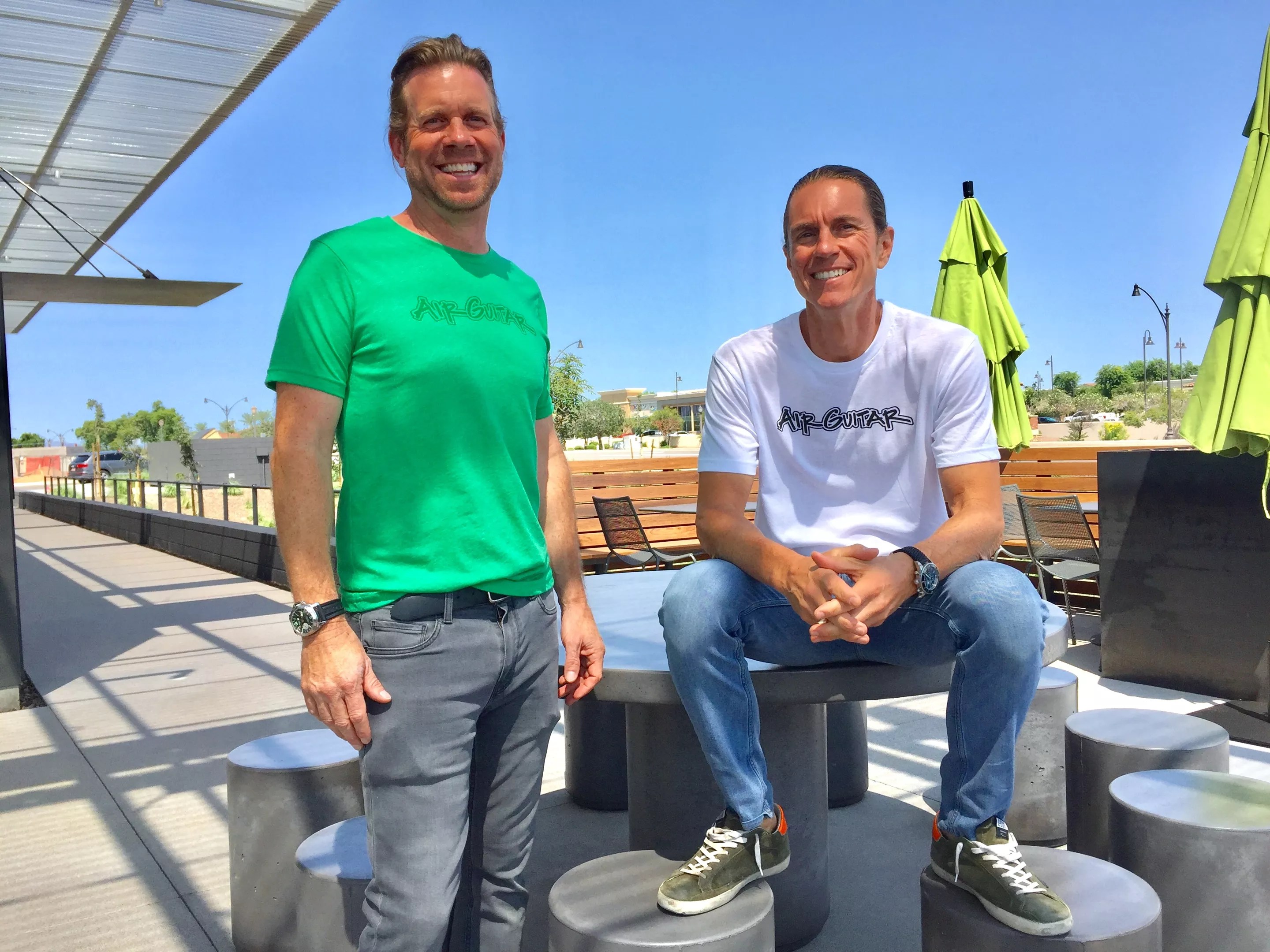Craig DeMarco and Eric Seitz pose on Air Guitar’s patio.