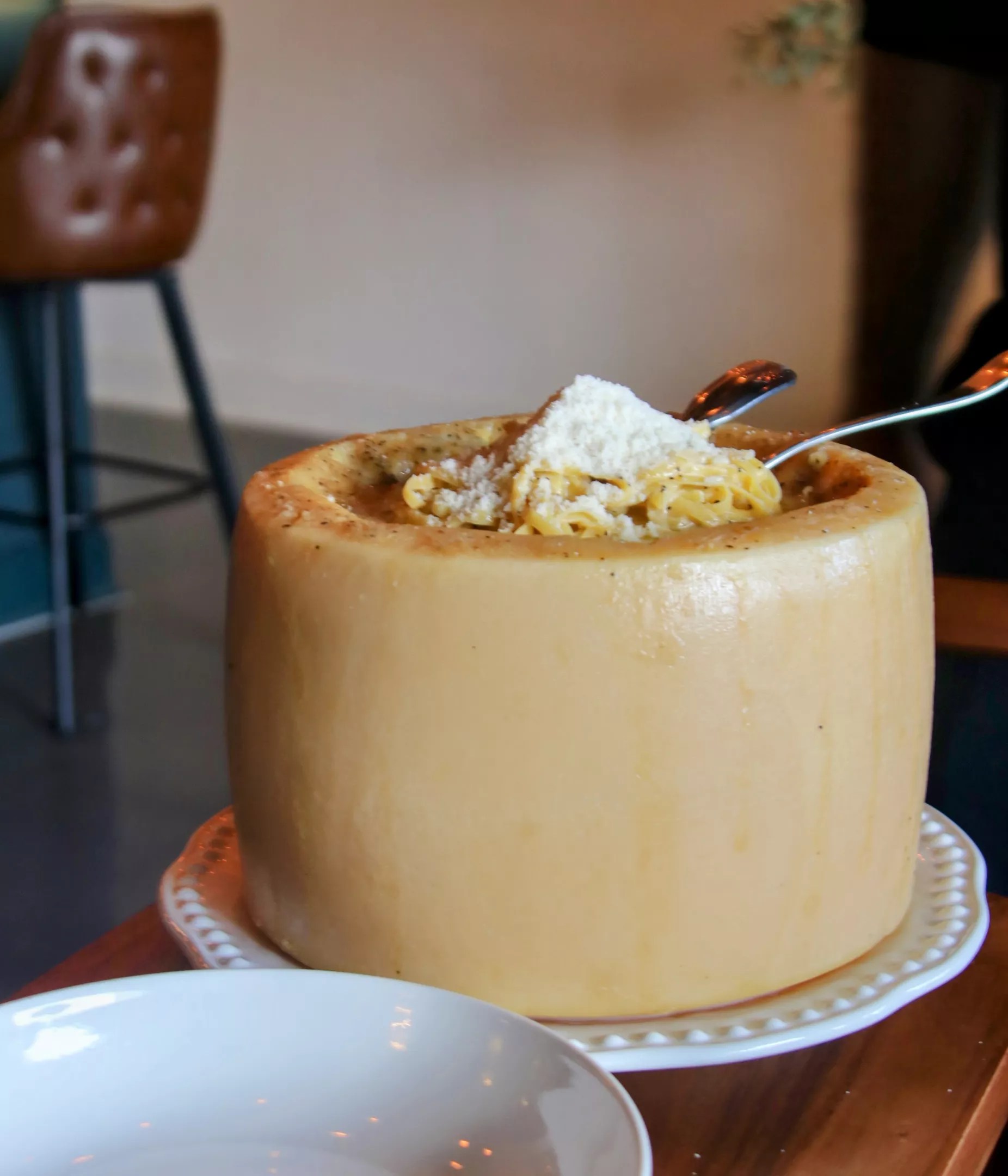 Chef Osmany Diaz and his team craft cacio e pepe tableside, swirling the fresh pasta in a pecorino cheese wheel.